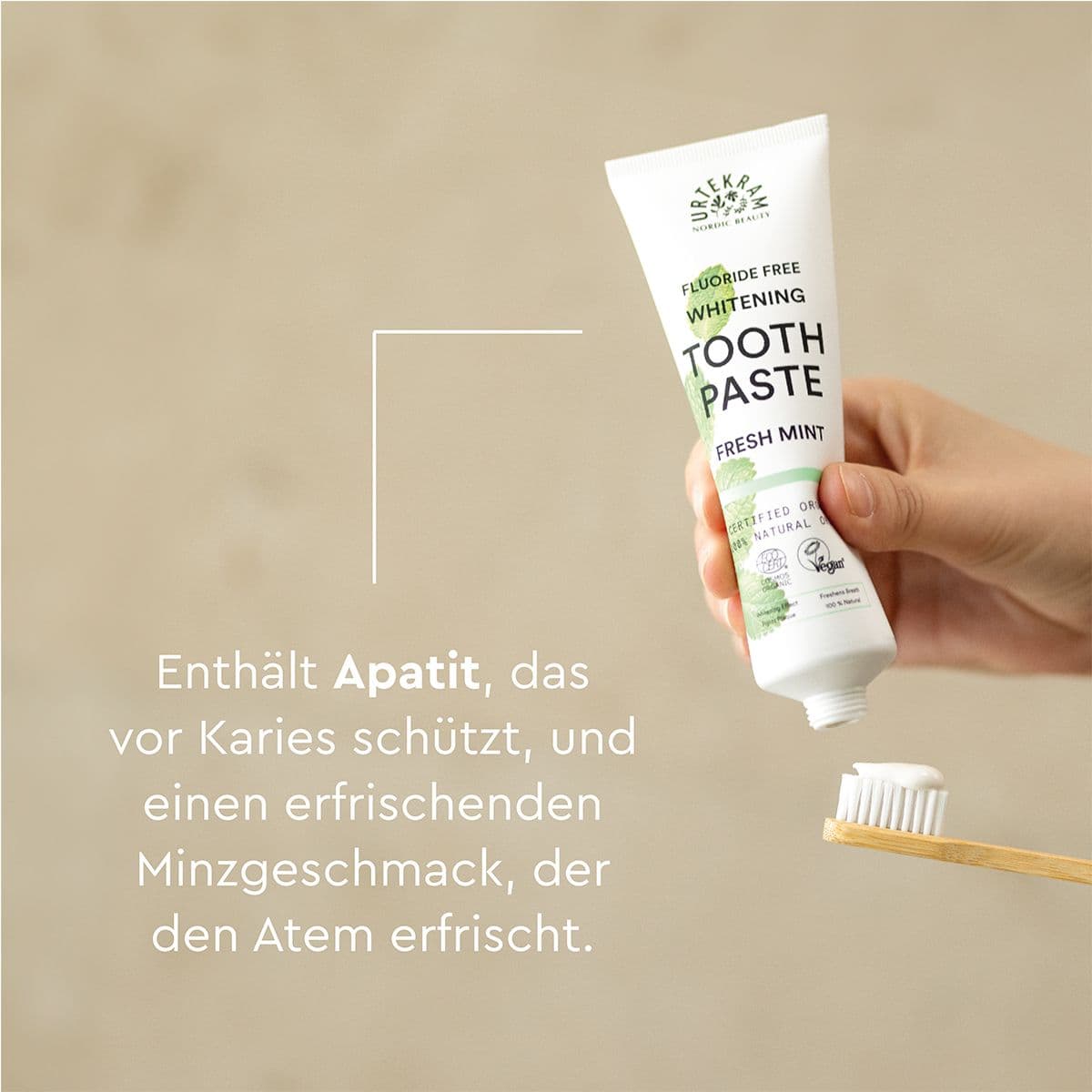 Die URTEKRAM Zahnpasta Mint - Fresh Whitening ist eine Zahncreme für die tägliche, natürliche Zahnpflege mit einem erfrischenden Minzgeschmack.