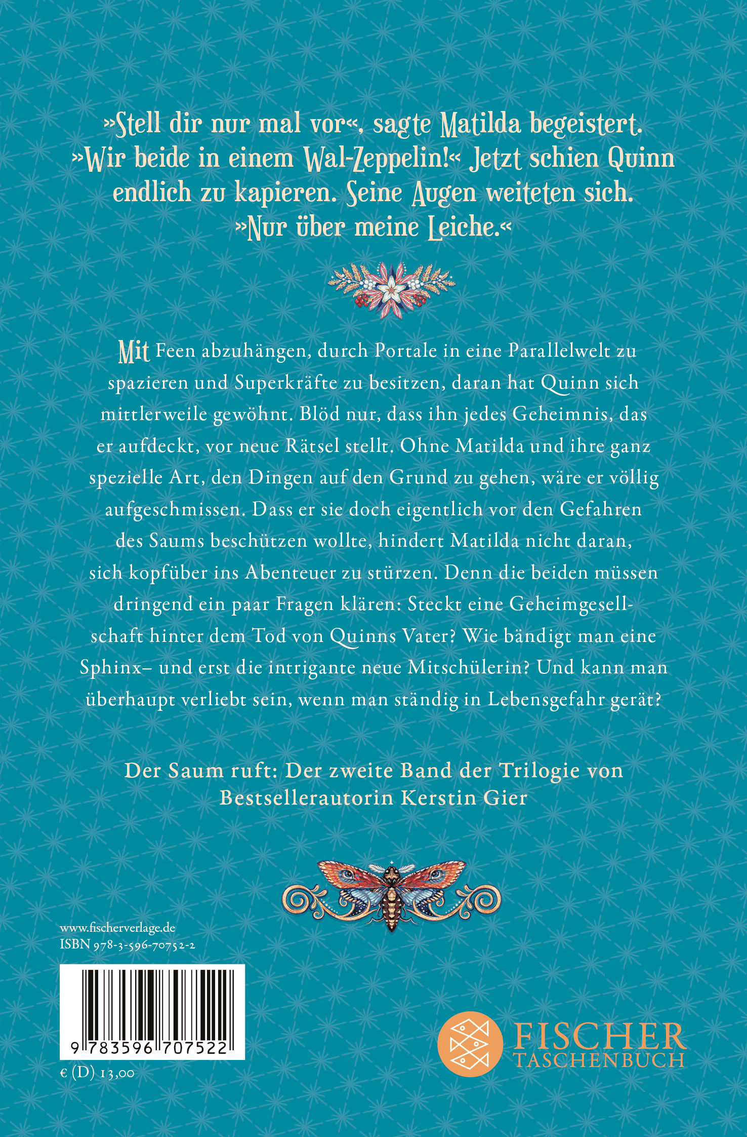 Mit Feen abzuhängen, durch Portale in eine mysteriöse Parallelwelt zu spazieren und Superkräfte zu besitzen – daran hat Quinn sich mittlerweile gewöhnt. Blöd nur, dass ihn jedes Geheimnis, das er aufdeckt, vor neue Rätsel stellt. Ohne Matilda und ihre ganz spezielle Art, den Dingen auf den Grund zu gehen, wäre er völlig aufgeschmissen. Dass er sie doch eigentlich vor den Gefahren des Saums beschützen wollte, hindert Matilda nicht daran, sich kopfüber ins Abenteuer zu stürzen. Denn die beiden müssen dringend ein paar Fragen klären: Steckt eine Geheimgesellschaft hinter dem Tod von Quinns Vater? Wie bändigt man eine Sphinx – und erst die intrigante neue Mitschülerin? Und kann man überhaupt verliebt sein, wenn man ständig in Lebensgefahr gerät?