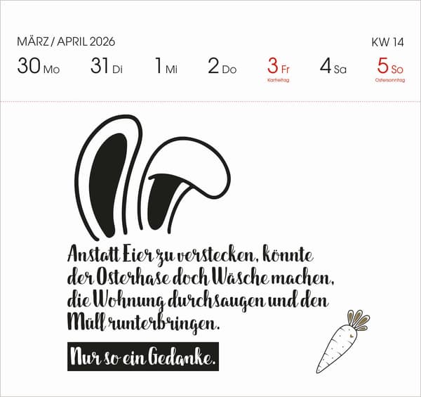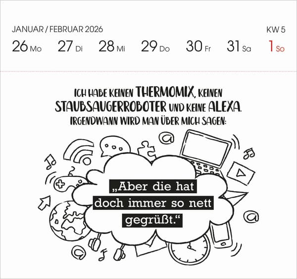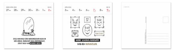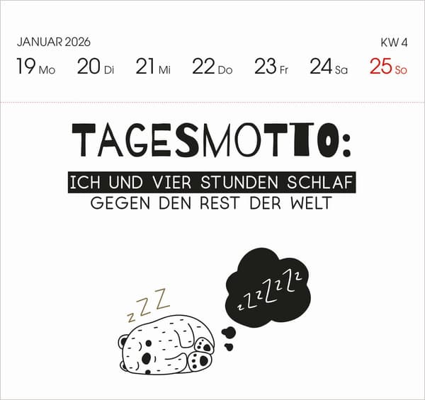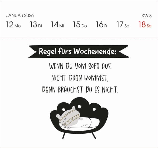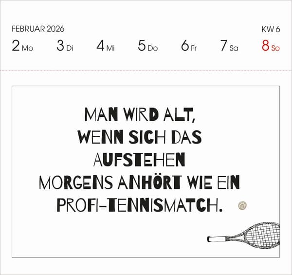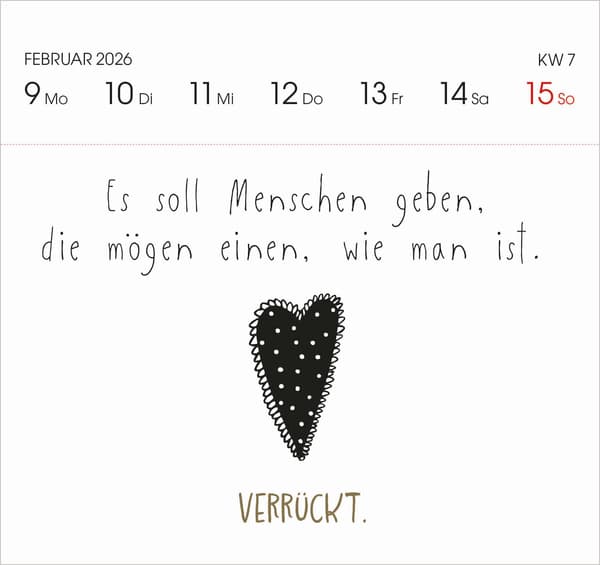 Produktmerkmale • Format: 17 x 16 cm; Wochenkalender mit 53 einzigartigen Sprüchen • Origineller Kunstkalender zum Aufstellen für alle Sprüche-Typo-Fans • Lustige-sinnige-Botschaften in verschiedenen Schriftarten • Kalendarium auf Deutsch mit hervorgehobenen Sonn- und Feiertagen für D,A und CH • Gedruckt auf umweltfreundlichem FSC Papier Visual WordsEin Wochenkalender voller genialer Sprüche und Zitate. Text und Typografie verschmelzen zu einem Gesamtkunstwerk, das nicht nur den Geist, sondern auch das Auge anspricht. Dabei bleibt der Kalender dezent - nur wenige Buchstaben tanzen über den hellen Hintergrund des Bildes, um in diesem Kalender Woche für Woche die Schönheit und Sinnhaftigkeit eines poesievollen Spruches oder trendigen Lebensgefühls hervorzuheben. Mit 53 witzigen Sprüchen, weisen Zitaten und coolen Statements: zum Sich-darin-Wiederfinden, zum Sich-Krumm-und-Schieflachen, zum Aus-dem-Grinsen-nicht-mehr-Rauskommen, zum Dauersinnieren und Rumphilosophieren, zum Wegweisenden-Inspirieren. Postkartenkalender Jedes Kalenderblatt ist so gestaltet, dass es einfach abzutrennen ist. Somit können Sie jede Woche eine Postkarte mit einem schönen Spruch versenden oder verschenken.
