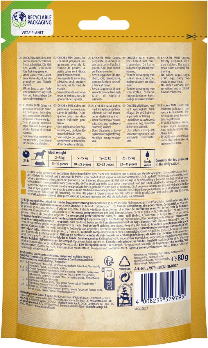 Dank ihrer extra kleinen Größe eignen sich unsere Vitakraft® Fleischsnacks Mini für Hunde einfach optimal dafür deinen Liebling öfter zu belohnen. Die Mini Chicken Cubes sind hochwertige, extra fleischige Snacks, die mit purem Fleisch frisch zubereitet werden – und einfach köstlich schmecken! Die Rezeptur unserer Minis kommt ganz ohne Zusatz von Zucker, Soja, Getreide, Ei, Milchprodukten und Fleischmehlen aus. Auf Zusatzstoffe wie Konservierungsmittel und Geschmacksverstärker wird bei der Herstellung konsequent verzichtet. Für Genuss mit gutem Gefühl sorgen jetzt auch unsere nachhaltig konzipierten Verpackungen. Diese sind kompakt im Design und voll recyclingfähig.