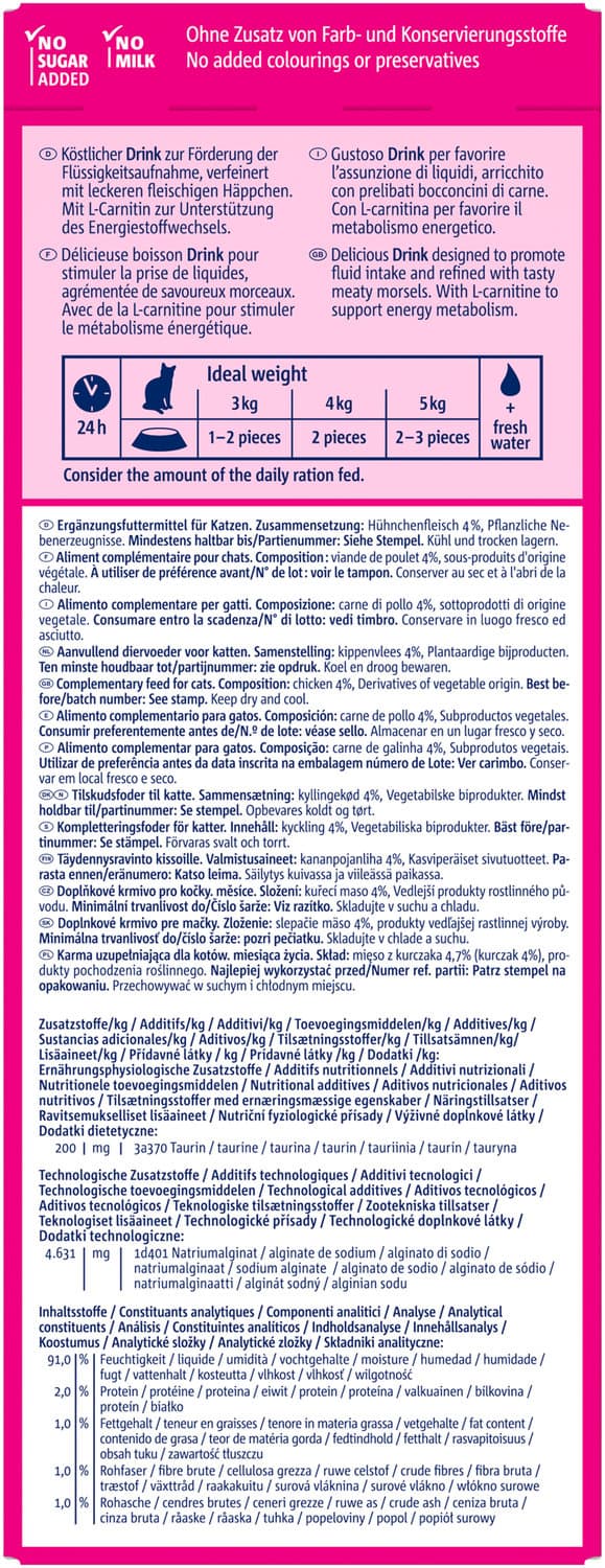 Ein ausgewogener Flüssigkeitshaushalt ist essentiell wichtig für die Gesundheit deiner Katze. Unser neuer Vitakraft® Drink unterstützt eine positive Trinkroutine und Flüssigkeitsaufnahme, die Katzen brauchen – und ist dabei unwiderstehlich lecker. Die speziell abgestimmte Formel mit Taurin unterstützt eine gesunde Augen- und Herzfunktion. Der Vitakraft® Drink kommt in der köstlichen Geschmacksrichtung Huhn. In den praktischen Sachet bleibt jeder Drink frisch und ist außerdem perfekt portionier bar.