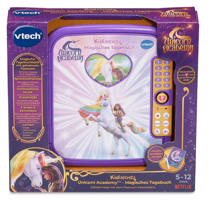 Tauche ein in die zauberhafte Welt der Unicorn Academy mit diesem interaktiven Tagebuch von VTech. Perfekt für kleine Einhorn-Fans ab 6 Jahren, bietet das magische Tagebuch eine sichere Möglichkeit, Gedanken, Träume und Geheimnisse mit einem persönlichen Code zu schützen.