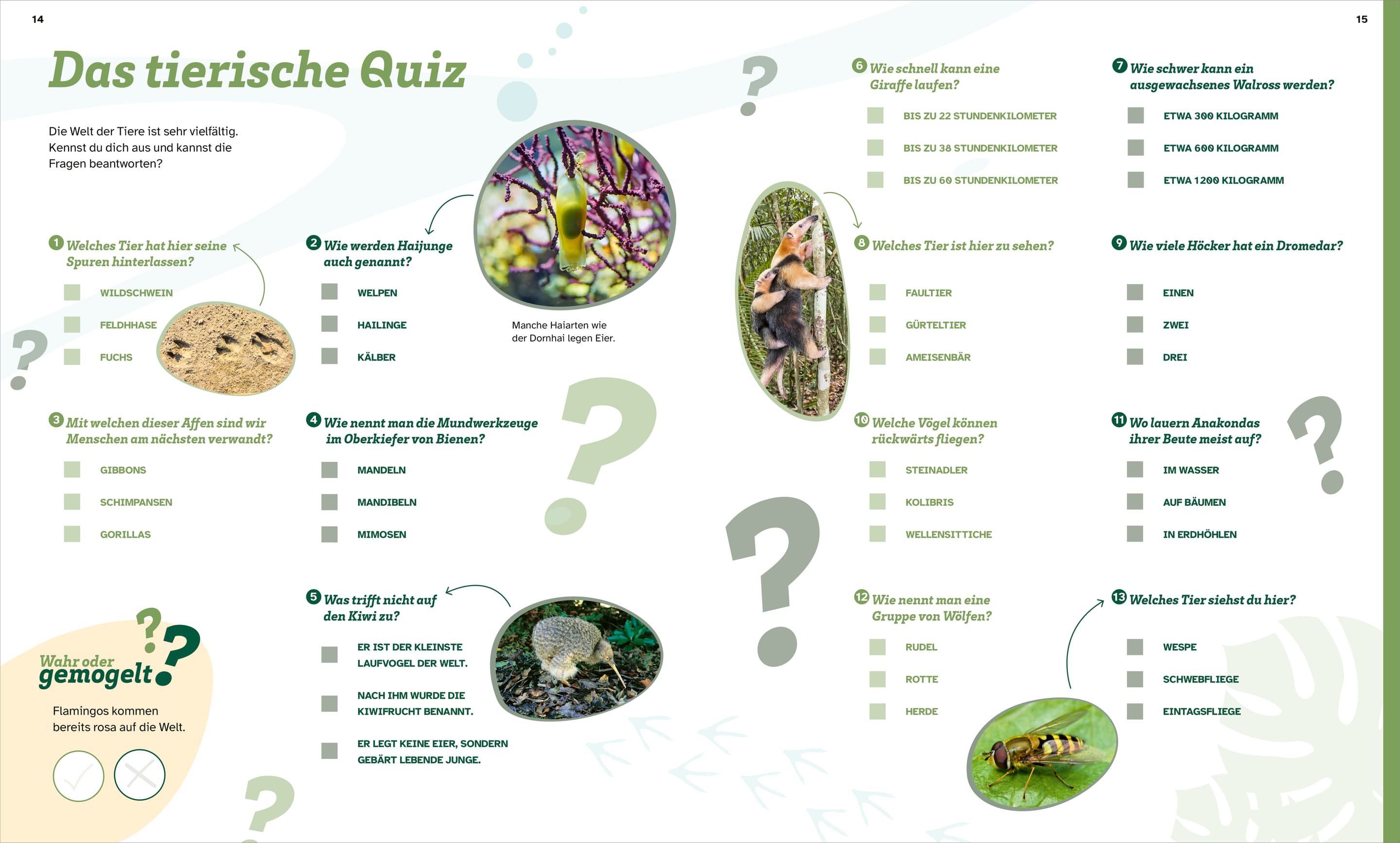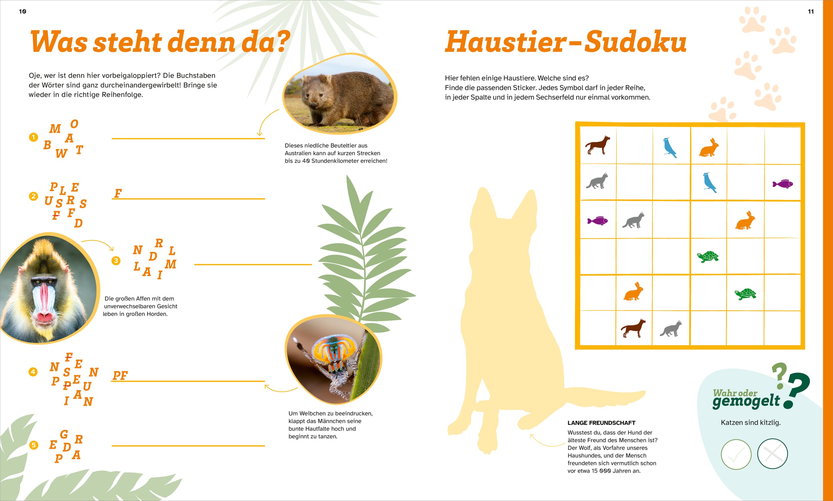 Hier ist tierisch was los! Kniffeliger Rätselspaß und bunte Sticker liefern Unterhaltung und Wissen über Tiere. Mit erstaunlichen Infos und vielen tollen Fotos erfahren die Kinder Wissenswertes über die Tiere auf der ganzen Welt. Welche Tiere leben im Regenwald? Wer ist der älteste Freund des Menschen? Wer sind die Rekordhalter in der Tierwelt? Mit bunten Rätseln und niedlichen Stickern lernen die Kinder spielerisch viele verschiedene Tiere kennen. Geeignet für Kinder ab 8 Jahren.