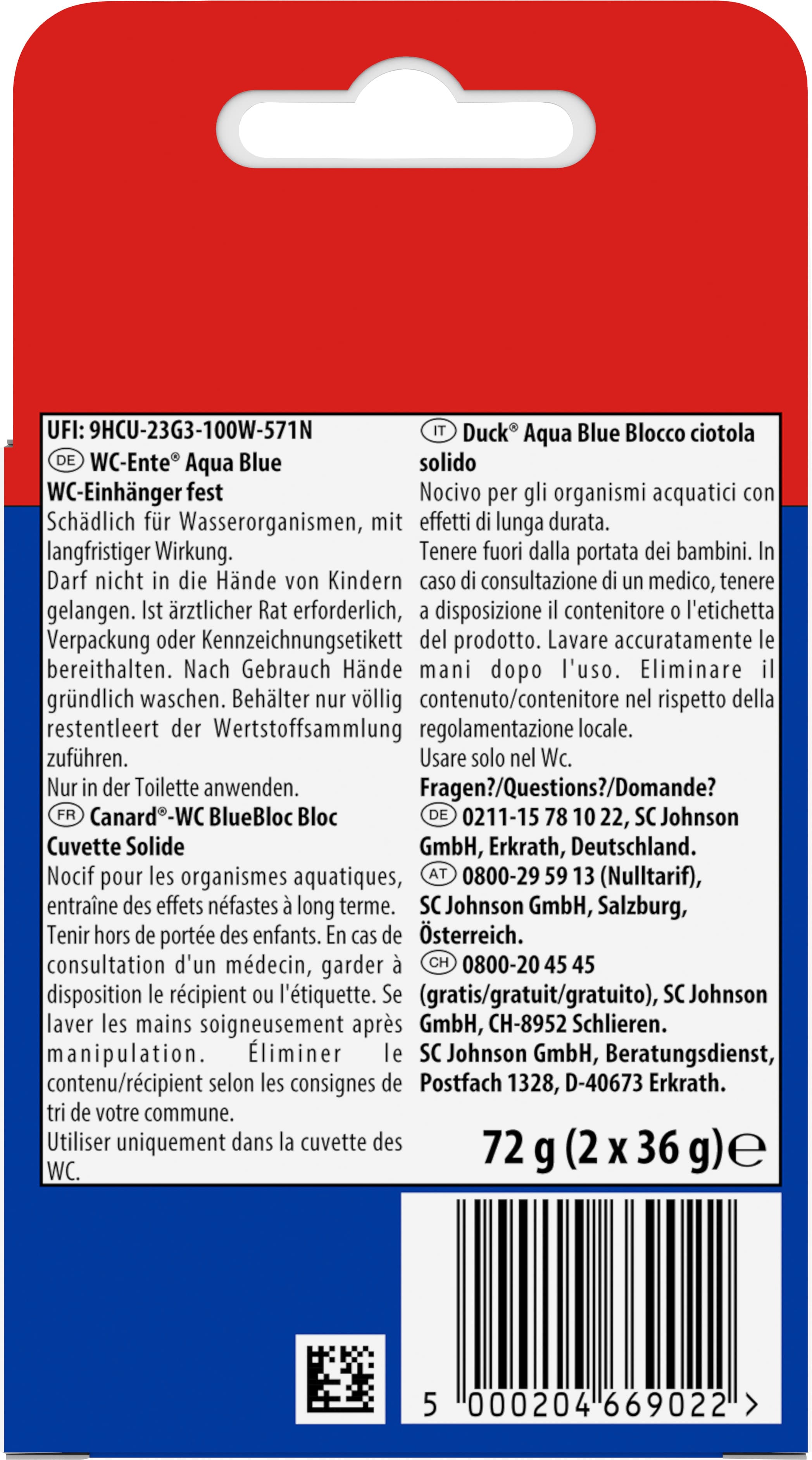 | Anwendungshinweis | 1. Die äußere transparente (bedruckte) Folienverpackung entfernen; diese ist nicht wasserlöslich. 2. Den sich unmittelbar um den WC-Stein befindlichen Schutzfilm nicht entfernen; dieser Film ist wasserlöslich. 3. Wenn das Körbchen leer ist, dieses vom Beckenrand entfernen, öffnen, gegebenfalls Reste entfernen und Nachfüller einlegen. So am Beckenrand einhängen, dass der WC-Ente Aqua Blue 4in1 mit jeder Spülung vom Wasser umspült wird. 5. Nach dem Einhängen Hände waschen. |