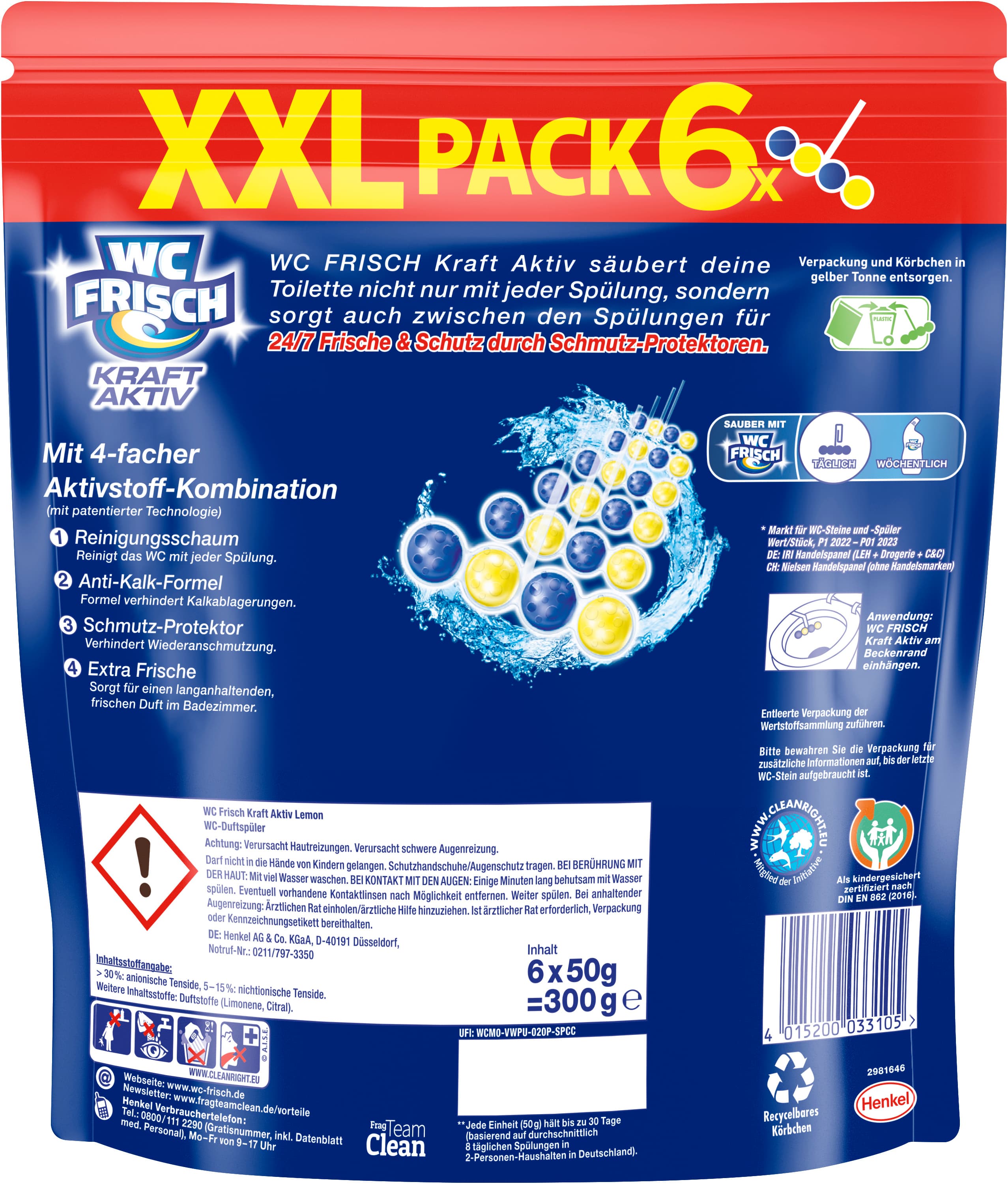 WC FRISCH Kraft Aktiv Duftspüler Lemon – Reinigung und intensiver WC Duft mit Anti-Kalk EffektDer WC FRISCH Kraft Aktiv Duftspüler Lemon sorgt dank patentierter Technologie für eine noch intensivere Reinigung bei jeder Spülung und 24/7 lang anhaltende hygienische Frische und Schutz. Mit der innovativen WC FRISCH 4-fach Aktivstoff-Kombination sorgt das WC Produkt für eine effektive Reinigung dank Reinigungsschaum, Anti-Kalk-Formel, Schmutz-Protektor und Extra Frische. Dank seines dezenten Designs und seinen tollen Farben passt der WC Duftspüler ideal unter den Toilettenrand.Die Produktvorteile im Detail:4-fach Aktivstoff-KombinationAnti-Kalk EffektReinigungsschaumSchmutz-ProtektorExtra FrischeDezentes DesignAnwendung:1. WC Duftstein an den Rand der Toilettenschüssel hängen.2. Toilettenstein dem Wasserfluss anpassen und Sauberkeit sowie einen intensiven Toilettenduft mit jeder Spülung erleben.3. WC Duftspüler ersetzen, wenn die Kugeln leer sind.Die Marke WC FRISCHWC FRISCH, der Experte für Toilettenreinigung, bietet viele Lösungen, um Ihnen das Leben im Bereich Sauberkeit und Frische in Ihrer Toilette zu erleichtern. Seit der Markteinführung des ersten WC-Steins im Jahre 1968 hat WC FRISCH nie aufgehört, den Markt der Toilettenreiniger und -erfrischer zu revolutionieren. Die Produkte von WC FRISCH helfen Ihnen, die Toilette sauber und frisch zu halten – bis zu 4 Wochen.