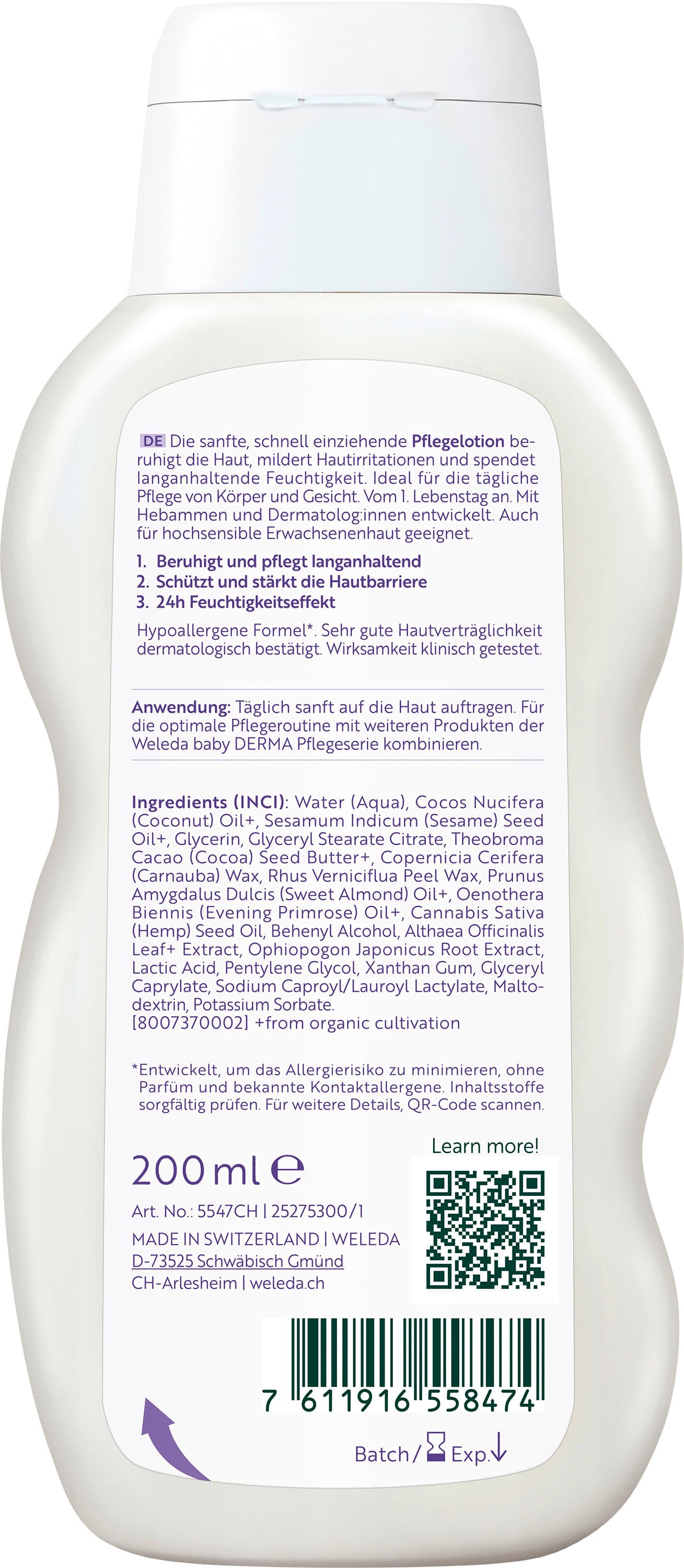 | Anwendungshinweis | Täglich sanft auf die Haut auftragen. Für die optimale Pflegeroutine mit weiteren Produkten der Weleda baby DERMA Pflegeserie kombinieren |