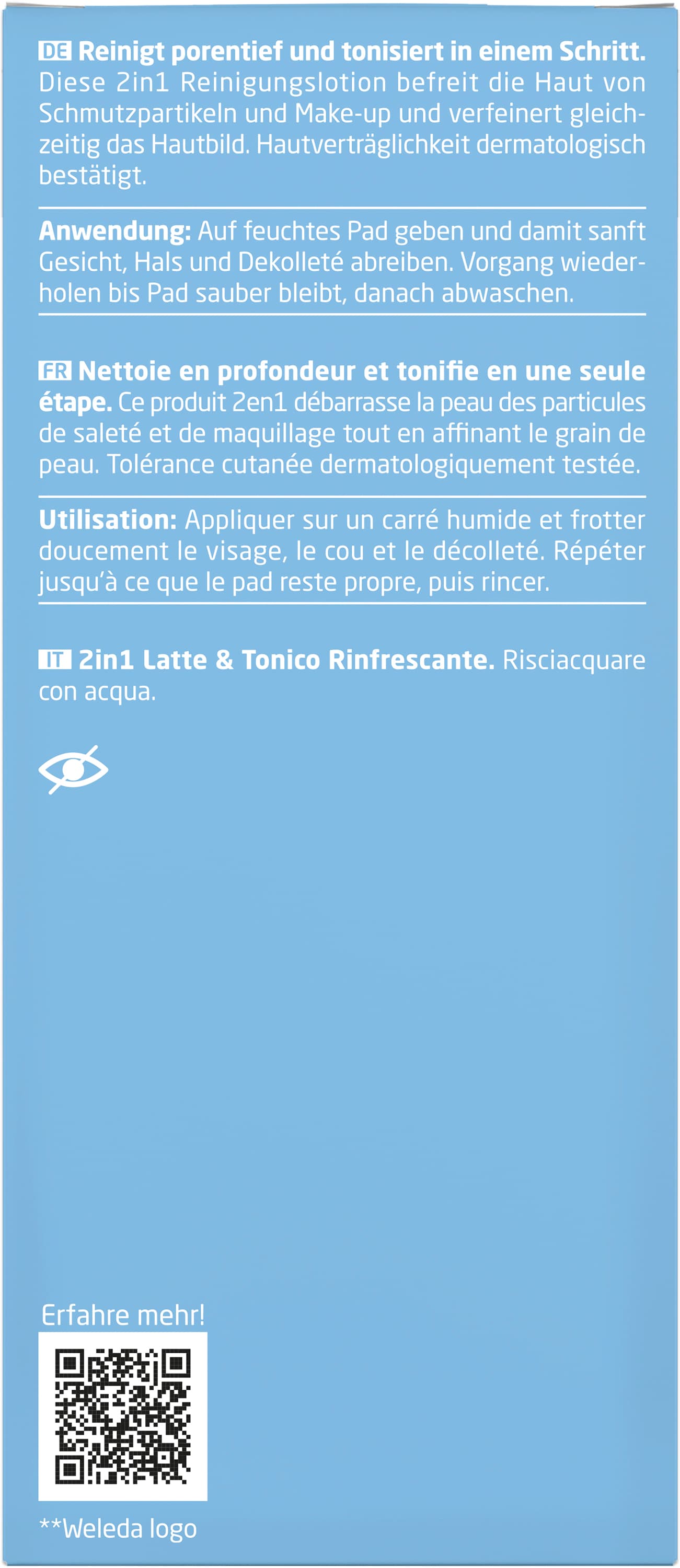 AnwendungshinweisZur täglichen Pflege morgens und abends auf einen angefeuchteten Wattepad geben und damit Gesicht, Hals und Dekolleté sanft abreiben – den Augenbereich dabei aussparen. Den Vorgang wiederholen, bis die Watte sauber bleibt. Anschließend mit Wasser abnehmen.