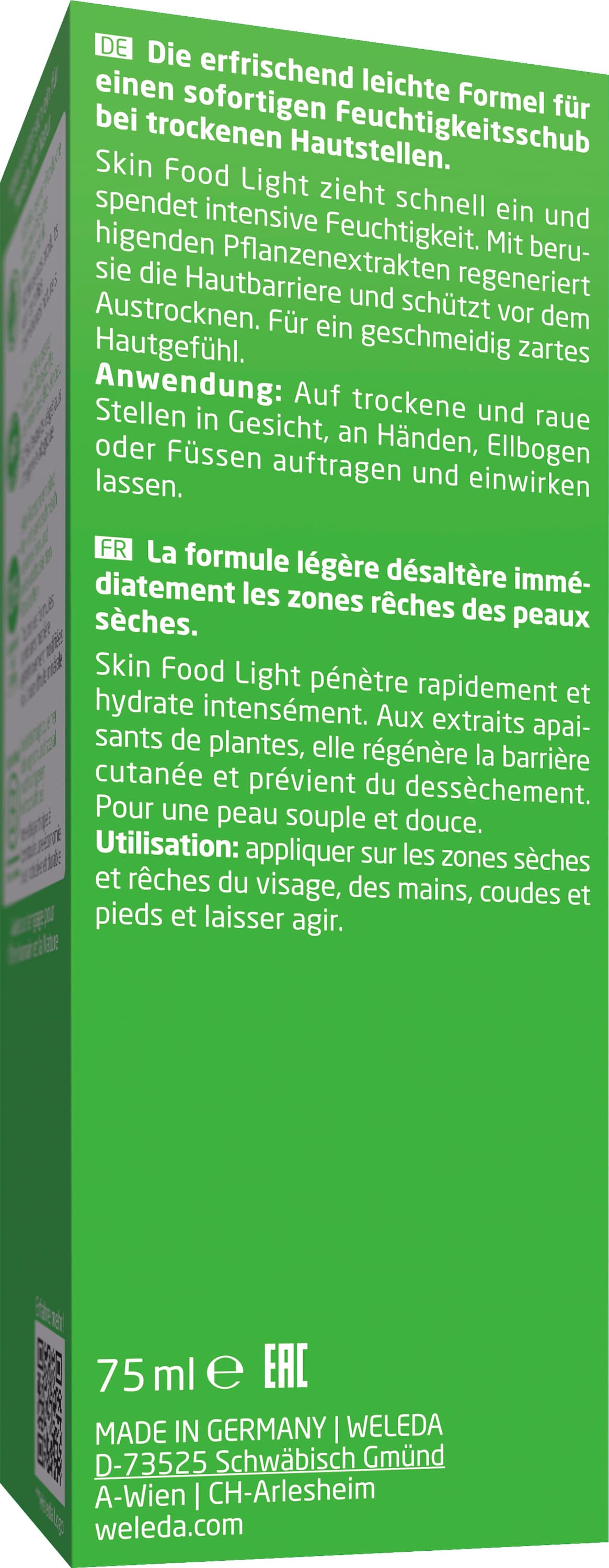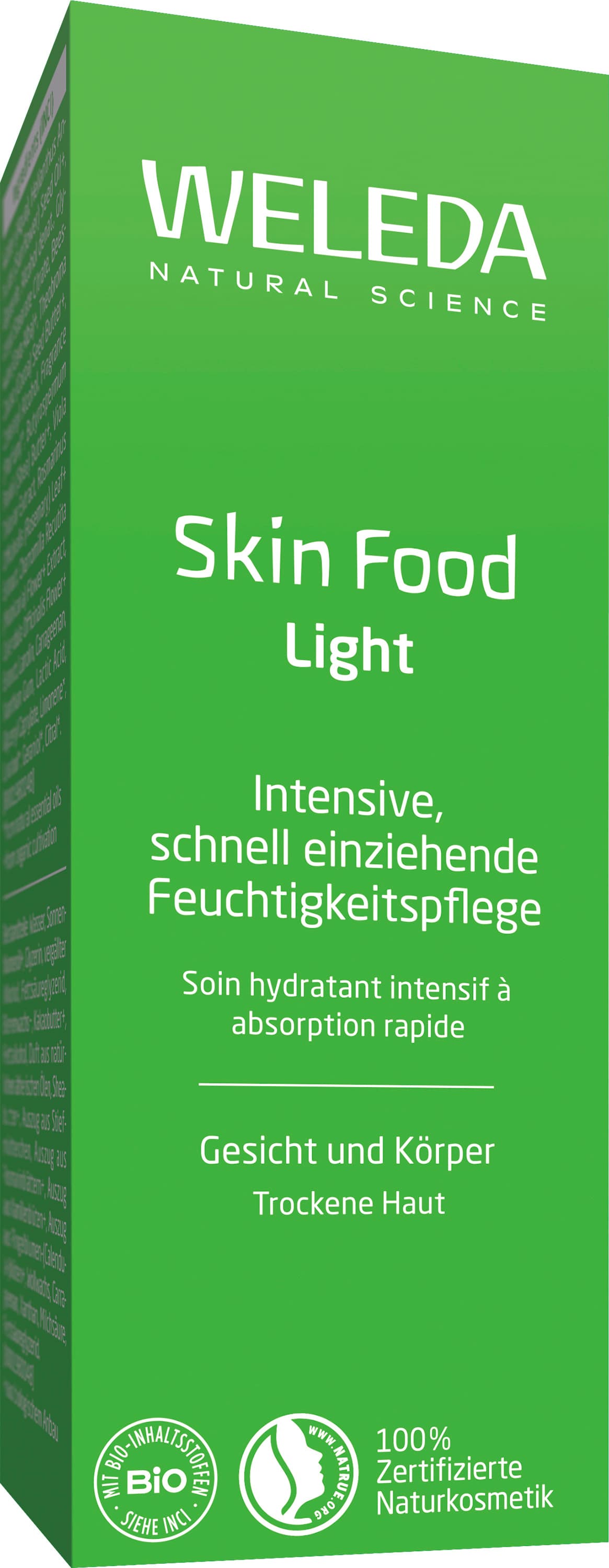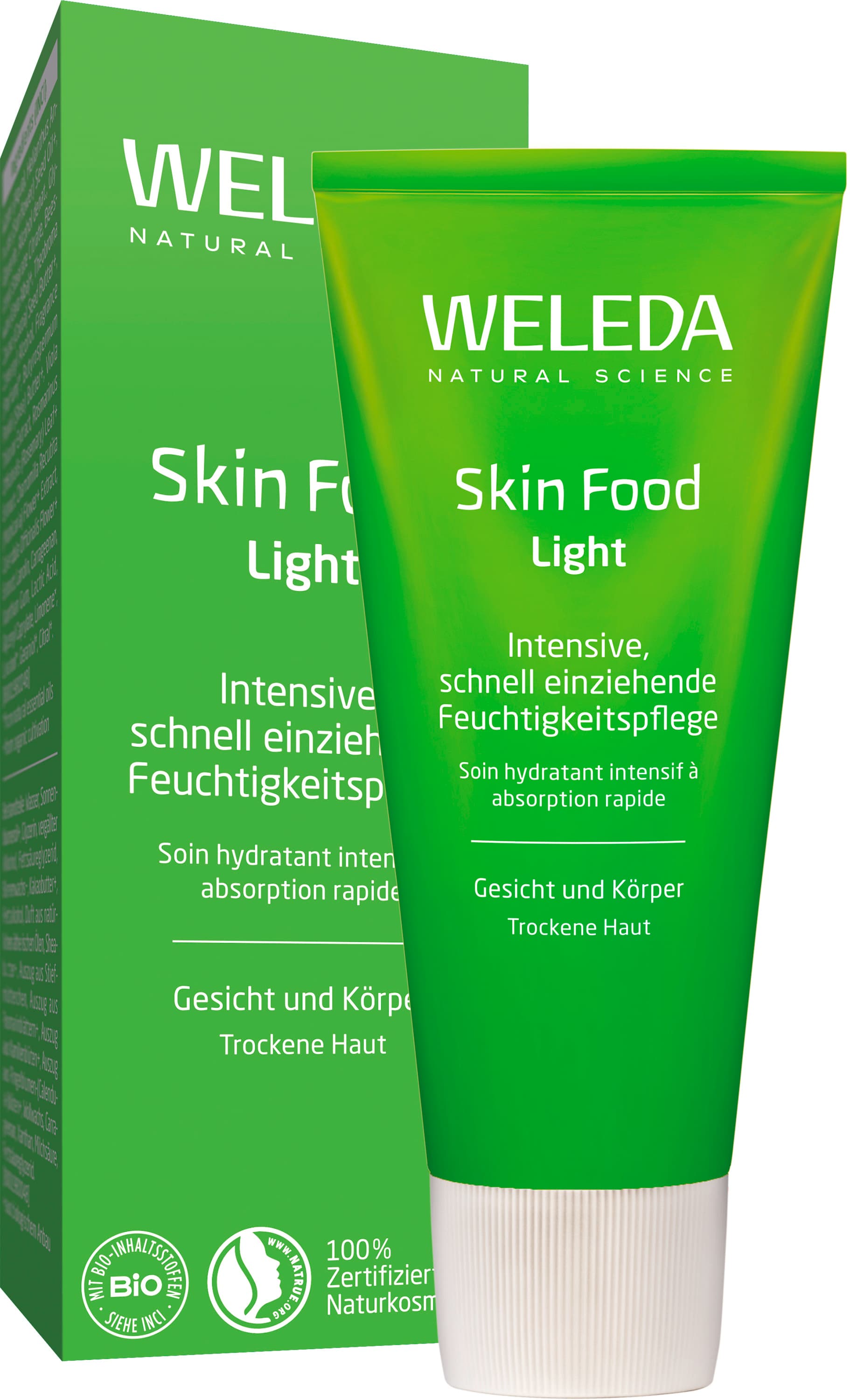 Skin Food Light - die erfrischend leichte Formel für einen sofortigen Feuchtigkeitsschub bei trockener Haut.Skin Food Light spendet sofort intensive Feuchtigkeit und zieht schnell ein. Mit beruhigenden Pflanzenextrakten regeneriert sie die Hautbarriere und schützt vor dem Austrocknen. Für ein geschmeidig zartes Hautgefühl.