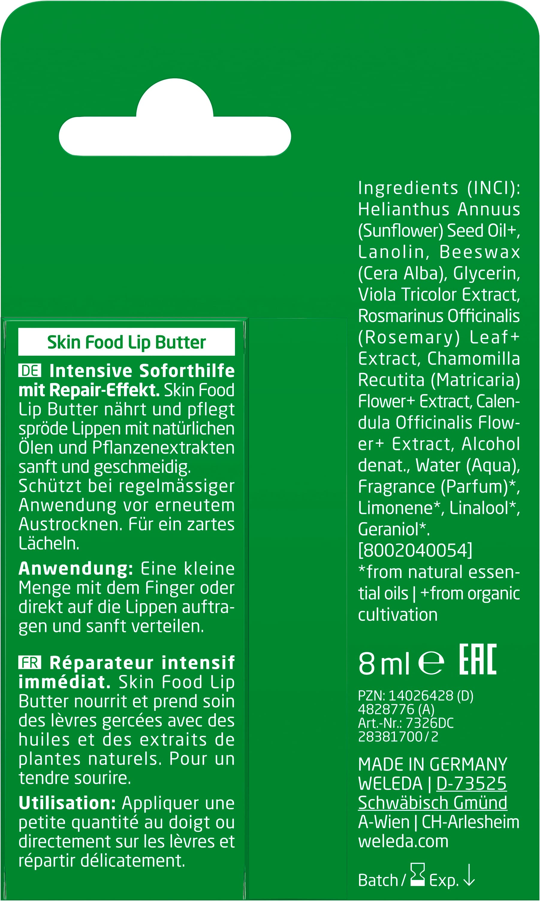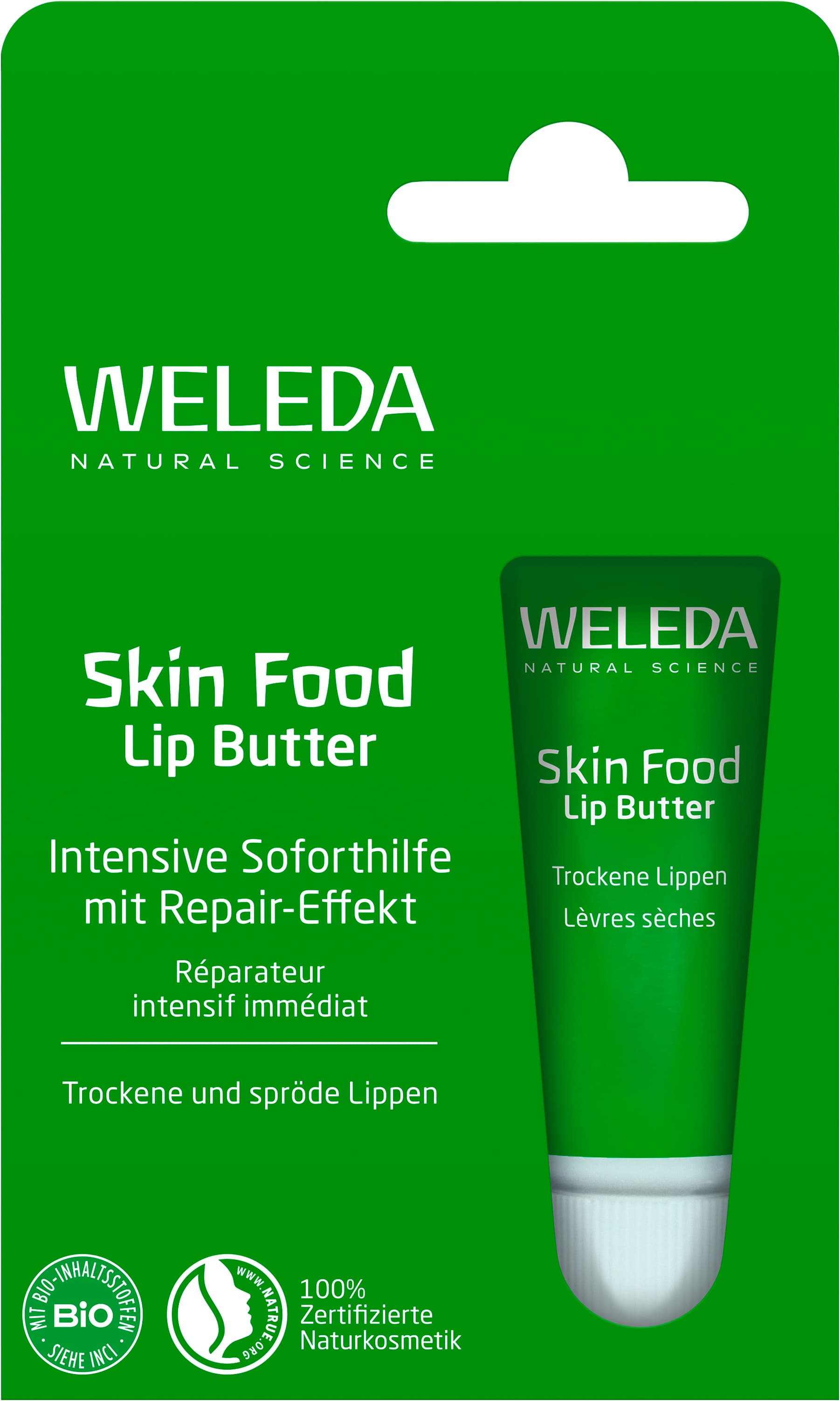Weleda Skin Food Lip Butter ist Superfood für trockene und spröde Lippen. Bio-Sonnenblumenöl und Bienenwachs sowie wertvolle Pflanzenextrakte aus Stiefmütterchen, Kamille, Rosmarin und Calendula machen selbst sehr raue und spröde Lippen wieder geschmeidig zart. Einfach die kleine, grüne Tube zücken und etwas Skin Food Lip Butter auftragen, um ein zartes Lächeln auf die Lippen zu zaubern. Anwendung: Eine kleine Menge Skin Food Lip Butter direkt auf die Lippen auftragen und sanft verteilen.