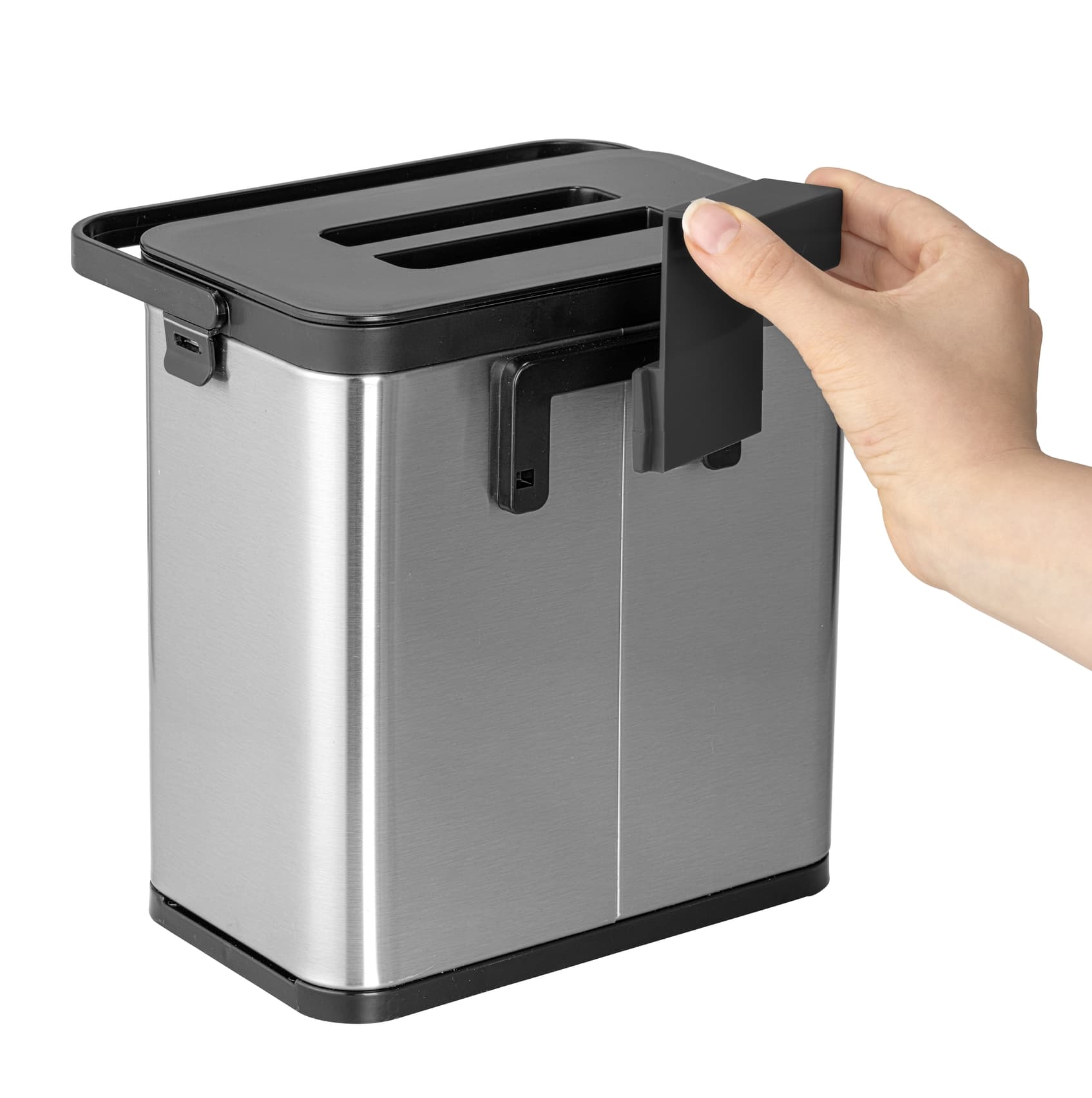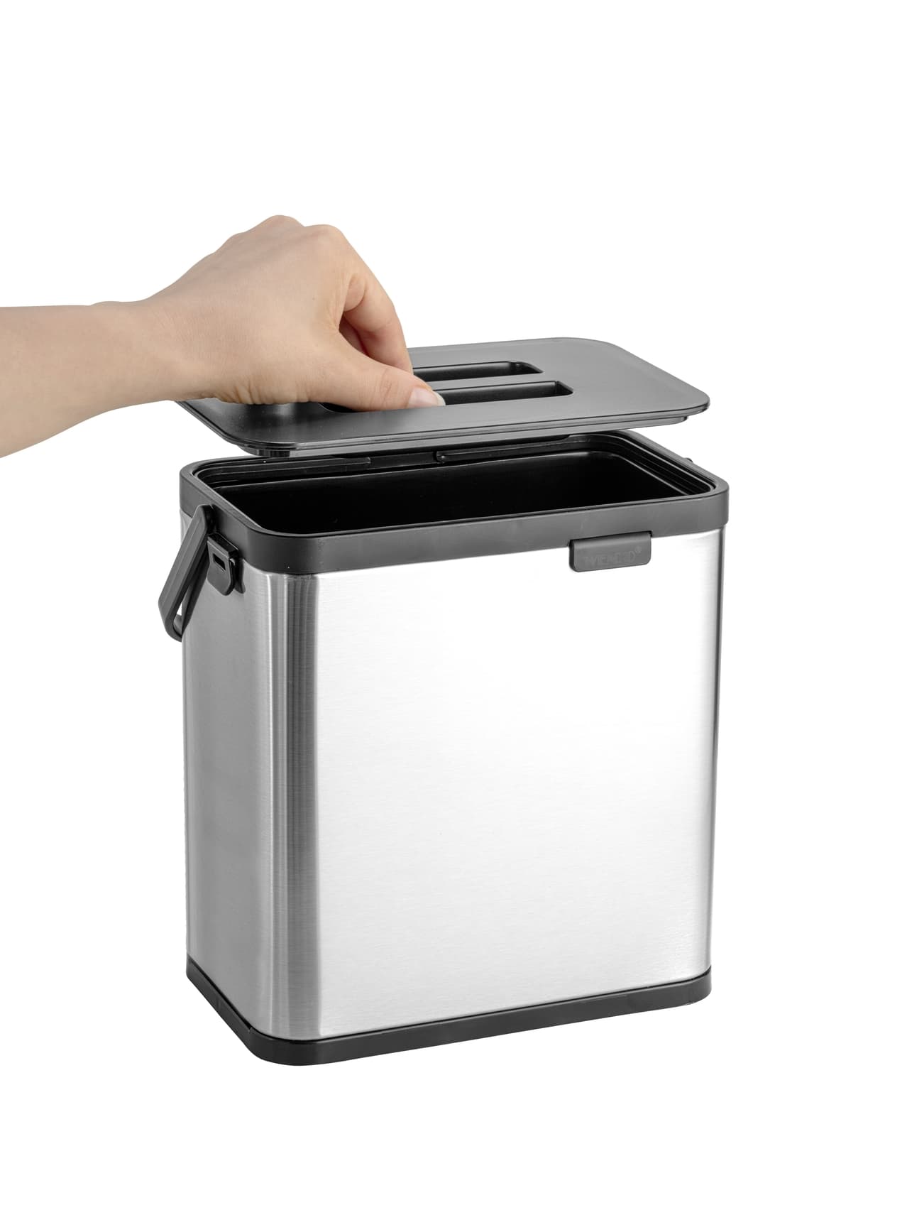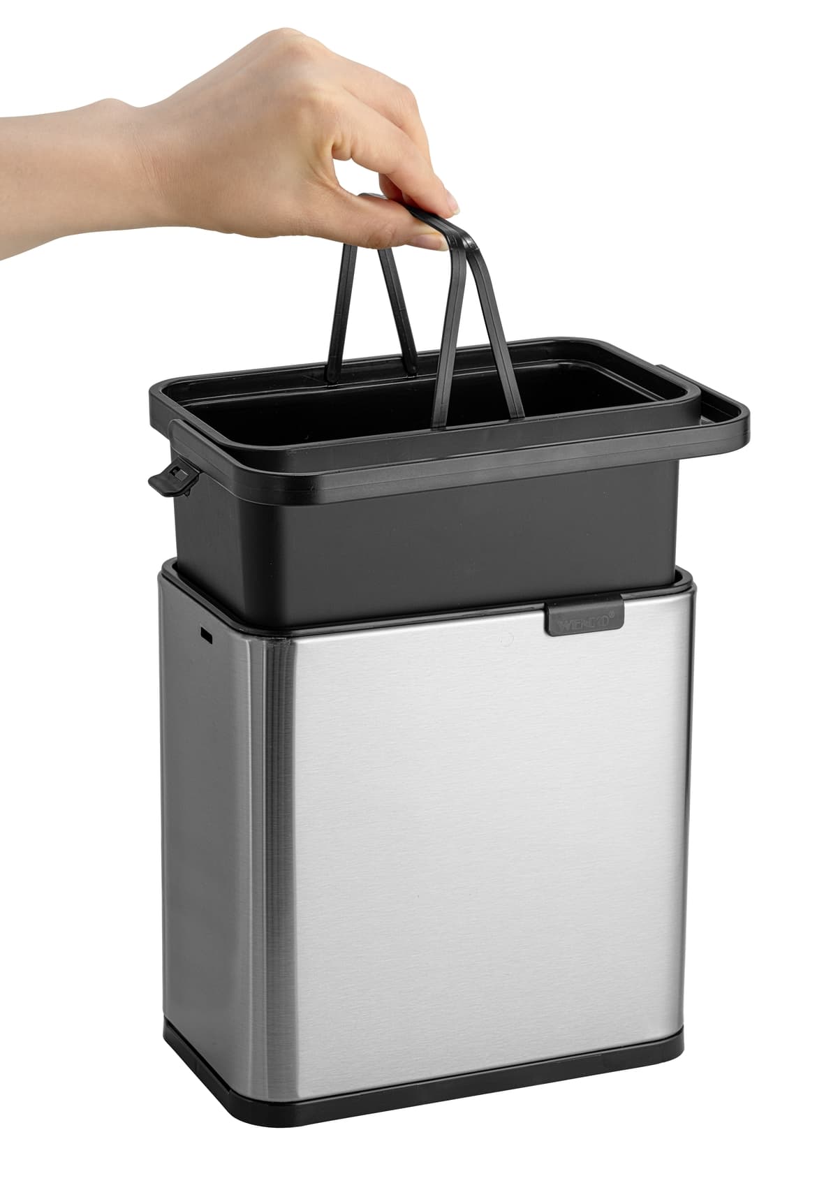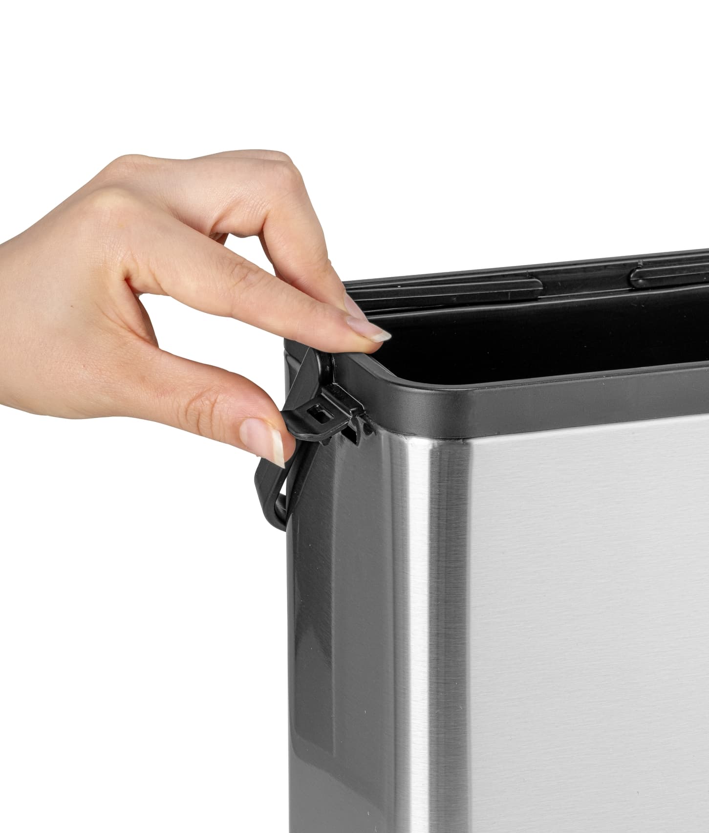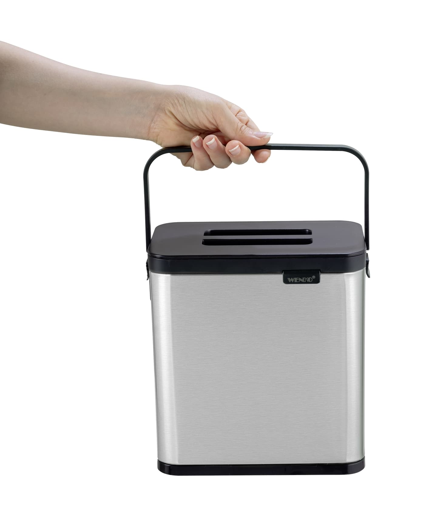 Der elegante Abfallsammler Colin von WENKO ist ein echter Blickfang in jeder Küche! Dieser kompakte Edelstahl Abfalleimer überzeugt durch sein Anti-Fingerprint-Finish, das lästige Fingerabdrücke verhindert, sowie seine Vielseitigkeit. Mit einem Fassungsvermögen von 3 Litern bietet der Abfallsammler ausreichend Platz für Küchenabfälle und sorgt gleichzeitig für ein stilvolles Ambiente in Ihrer Küche. Der praktische Abfalleimer mit Deckel ist freistehend und kann bei Bedarf auch hängend montiert werden. Dank der mitgelieferten Über-Tür- und Static-Loc®®-Befestigungsmöglichkeiten lässt sich der Abfallsammler flexibel in Ihrer Küche einsetzen. Der integrierte Griff erleichtert den Transport und die Entleerung des herausnehmbaren Innenbehälters. Dieser ist aus robustem Kunststoff gefertigt und vermeidet den direkten Kontakt des Abfalls mit dem Edelstahl – ideal, um Rost zu verhindern und die Langlebigkeit Ihres Abfalleimers zu sichern. Mit seiner mattsilbernen Optik und den schwarzen Akzenten fügt sich der stylische Edelstahl Abfalleimer nahtlos in jede Kücheneinrichtung ein. Die rutschfesten Füße sorgen für einen sicheren Stand, egal ob auf der Arbeitsplatte oder im Schrank. Ergänzen Sie Ihre Küchenausstattung mit diesem funktionalen und stilvollen Abfalleimer klein und erleben Sie Sauberkeit und Ordnung auf höchstem Niveau. Der Abfallsammler Colin ist die perfekte Lösung, um mehr Ordnung in Ihre Küche zu bringen. Entdecken Sie auch unsere weiteren praktischen Küchenhelfer, die Ihre Küchenorganisation unterstützen und den Alltag erleichtern. Investieren Sie in diesen hochwertigen Küchenabfalleimer und genießen Sie die Vorteile eines durchdachten Designs, das Funktionalität und Ästhetik vereint!