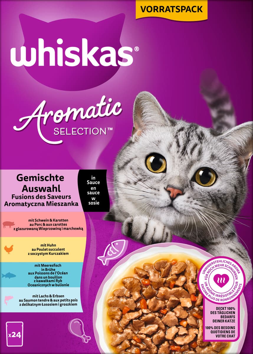Die WHISKAS® AROMATIC SELECTION™ Gemischte Auswahl eröffnet eine Welt voller aromatischer und unwiderstehlicher Mahlzeiten. Speziell ausgewählte Zutaten sind mit Aromen versetzt, die nachweislich die Sinne von Katzen erfreuen. Serviert mit einer großzügigen Portion schmackhafter Soße, schmeckt jedes Gericht genauso gut, wie es riecht.