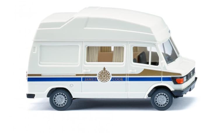 Es waren die Glanzzeiten des Camping-Experten Westfalia aus Rheda-Wiedenbrück, als der James Cook auf dem Mercedes-Benz-Transporter T1-Fahrgestellt entstand. Der Name James Cook, der vom berühmten Seefahrer aus dem 18. Jahrhundert stammt, sollte zum Synonym eines legendären Lieferwagen-Umbaus werden– die Wohnmobil-Ära hatte neue Ansprüche formuliert. Dieses große Modell wurde 1977 von Westfalia auf Mercedes-Benz-Fahrgestell entwickelt. Es war das erste Wohnmobil, das eine Nasszelle und eine Hartdachverlängerung miteinander kombinierte. Angetrieben von seinem guten Ruf sollte der James Cook den Weg für eine neue Generation moderner Transporter ebnen. Der erste James Cook wurde 1977 von Westfalia auf dem neuen Mercedes-Benz der Baureihe TN/T1 aufgebaut. 1976 hatte das Westfalia-Designbüro dafür die ersten Skizzen eines Transporters mit erhöhtem Dach und revolutionärem Grundriss entwickelt. Für Westfalia war es eine wirkliche Zeitenwende, denn nach Jahren der legendären Zusammenarbeit mit Volkswagen und seinen berühmten Wohnmobilen auf T1- und T2-Fahrgestell hatte man sich damals erstmals Mercedes-Benz zugewandt. Mit dem James Cook wurde eine neue Generation von Wohnmobilen mit Komfort und Sicherheit geschaffen. Was ihn auf den ersten Blick auszeichnete, war sein erhöhtes Dach, das eine Höhe von 3,10 m erreichte und eine begehbare Innenhöhe von 2,20 m ermöglichte. Mit seiner familiengeeigneten Bewohnbarkeit sollte der James Cook (5,24 m) zum Lieblingsbegleiter von Vielreisenden werden.