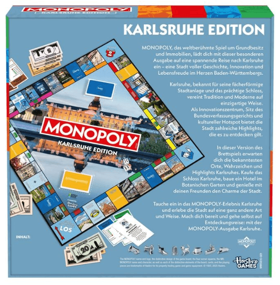 Entdecke Karlsruhe auf spielerische Weise mit Monopoly Karlsruhe, der exklusiven Stadtedition des beliebten Brettspielklassikers! Kaufe, verkaufe und tausche bekannte Straßen, Plätze und Sehenswürdigkeiten der Fächerstadt. Mit individuell gestalteten Ereignis- und Gemeinschaftskarten sowie liebevoll designtem Spielbrett wird jede Runde zum einzigartigen Erlebnis.