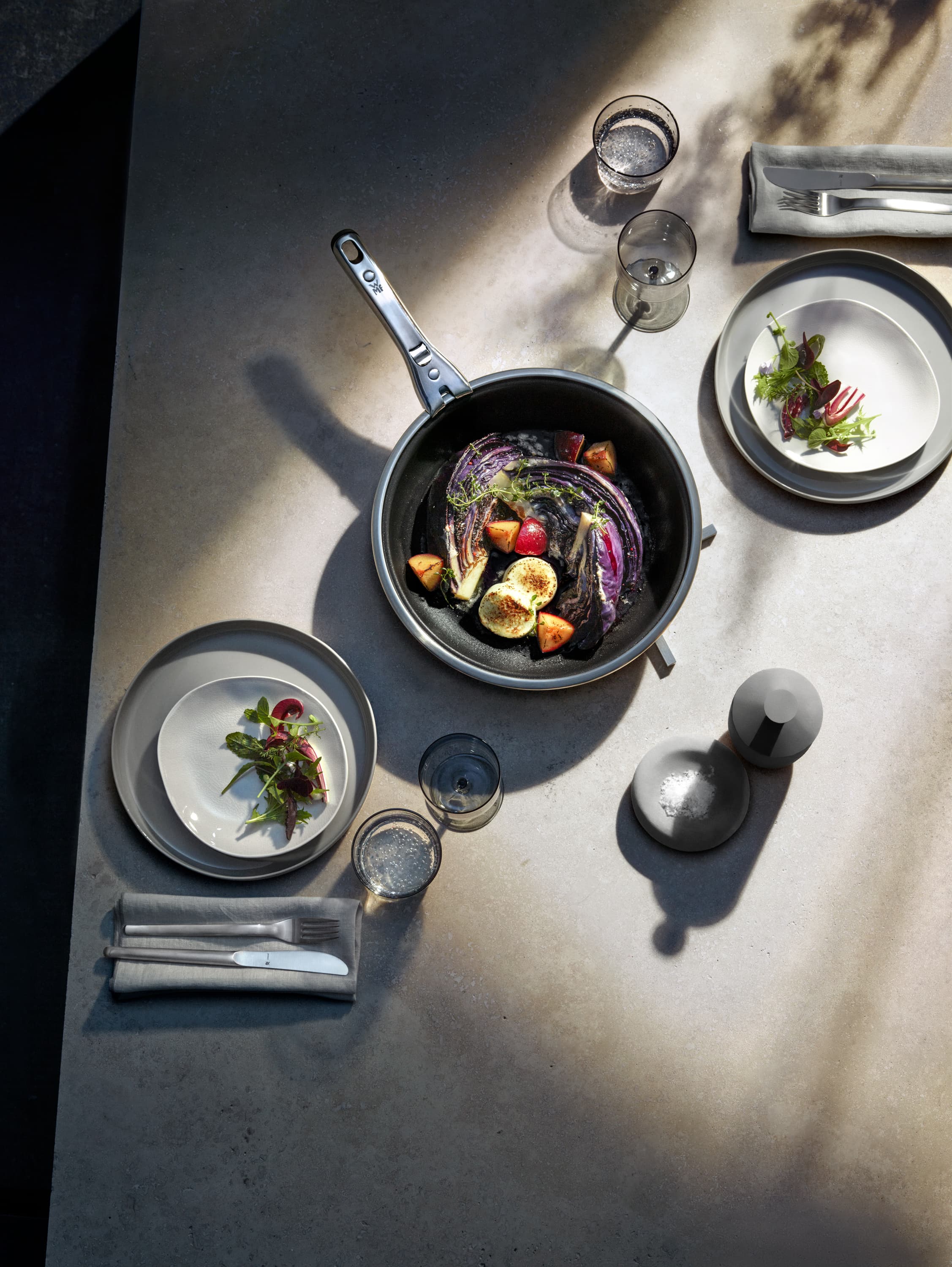Die optimale Lösung für kleinere Küchen mit wenig Stauraum und gleichzeitig multifunktional einsetzbar: Die Click&Serve Bratpfanne mit Antihaftversiegelung und 28 cm Durchmesser gehört zur ersten Kochgeschirr-Serie von WMF, bei der Kochgeschirr, Deckel und Griff einzeln zu erwerben sind. Vom Herd direkt in den Backofen, vom Backofen direkt auf den Tisch und sollte etwasübrigbleiben, direkt vom Tisch in den Kühlschrank: Der abnehmbare und mit jedem Kochgeschirr der Serie kompatible Griff erlaubt in jedem Fall eine platzsparende Unterbringung. Dazu verfügt erüber 10 Kilogramm Tragkraft und lässt sich genauso einfach, schnell und sicher an jeder beliebigen Stelle des jeweiligen Kochgeschirrs anbringen. Auch die passenden Deckel aus hochwertigem Glas sind dank der Schmetterlingsgriffe aus hochwertigem Kunststoff und Edelstahl mühelos stapelbar. Gefertigt aus genauso strapazierfähigem wie elegantem Cromargan®: Edelstahl Rostfrei 18/10,überzeugt die Bratpfanne auch mit einem breiten Schüttrand für tropffreies Ausgießen von Flüssigkeiten und dem energiesparendem TransTherm®-Allherdboden, der auch für Induktionsherde geeignet ist.