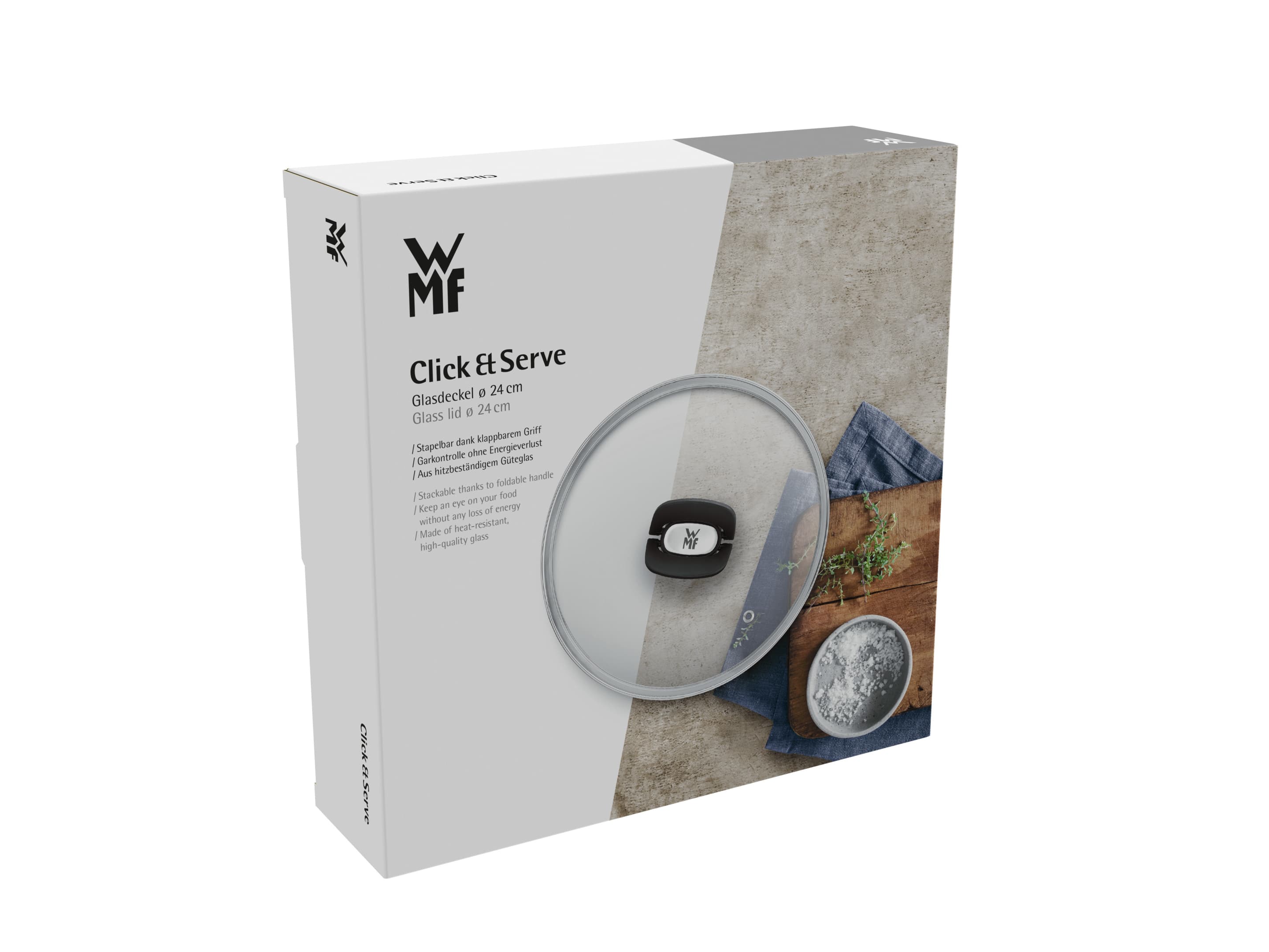 Click&Serve, die neue Kochgeschirr-Serie von WMF, begeistert mit einem innovativen, cleveren und sehr platzsparenden Konzept und multifunktionalen Einsatzmöglichkeiten. Der Click&Serve Deckel ist wie das jeweilige Kochgeschirr sowie der abnehmbare und universell einsetzbare Griff stets einzeln zu erwerben. Gefertigt aus hochwertigem Glas, ist der Click&Serve Glasdeckel mit 24 cm Durchmesser mit allen Kochgeschirren desselben Durchmessers kompatibel und ermöglicht beim Kochen und Braten jederzeit einen Blick ins Innere des Kochgeschirrs. Dank cleverer Schmetterlingsgriffe sind alle Click&Serve Glasdeckel, wie auch wie die Click&Serve Pfannen und Töpfe, stapelbar. Zur unkomplizierten Reinigung dürfen sie selbstverständlich in die Spülmaschine.