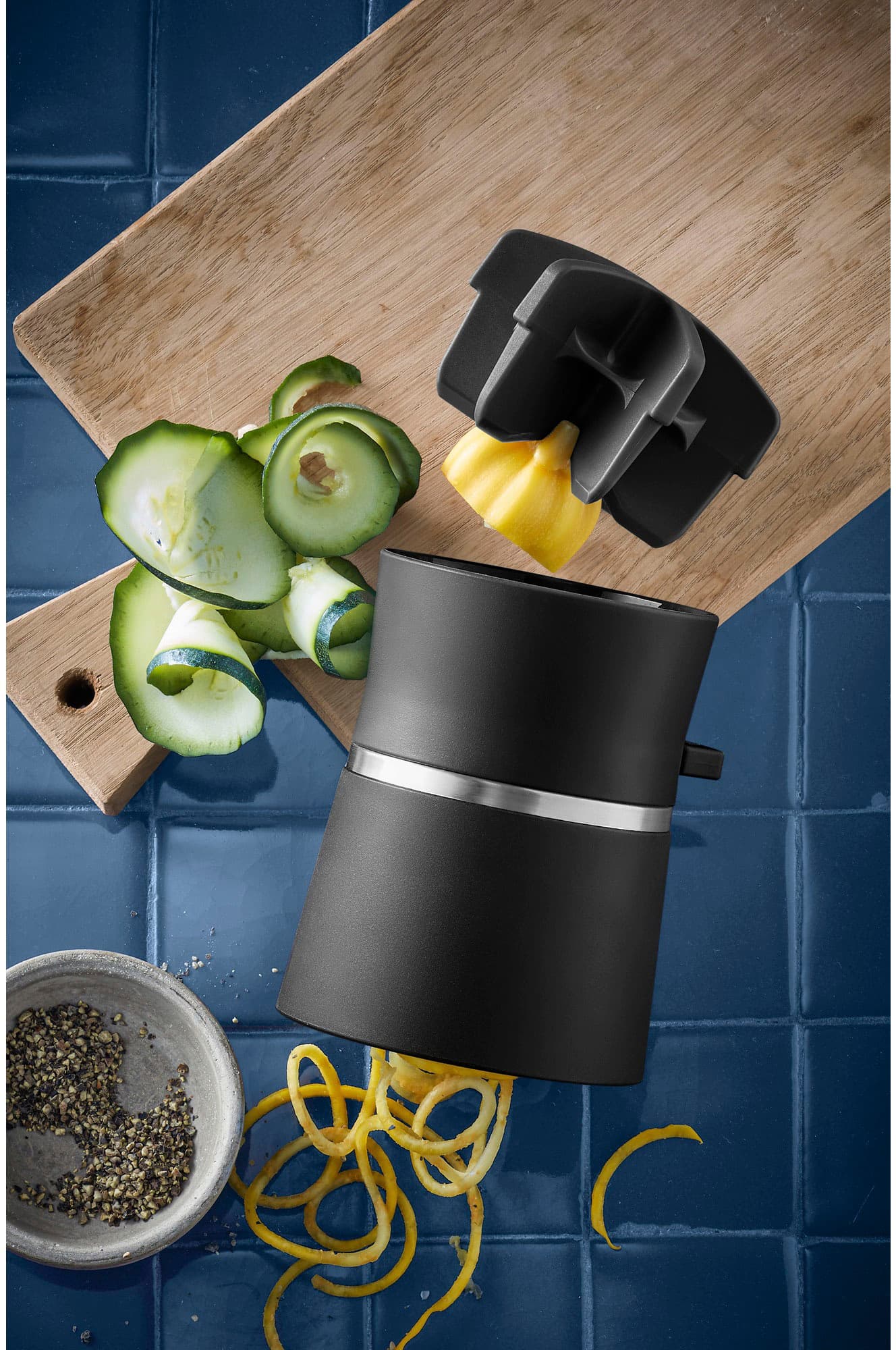 Der WMF Spiralschneider ist ein hochwertiger Gemüseschneider, der mühelos Spiralen und feine Streifen für Speisen und Beilagen schneidet, die so gut aussehen wie sie schmecken. Entfalten Sie Ihre Kreativität mit einem hochwertigen Küchenzubehör, das sich ideal für festes Gemüse wie Zucchini, Karotten, Radieschen, Rüben und mehr eignet. Hitzebeständig bis 130°C