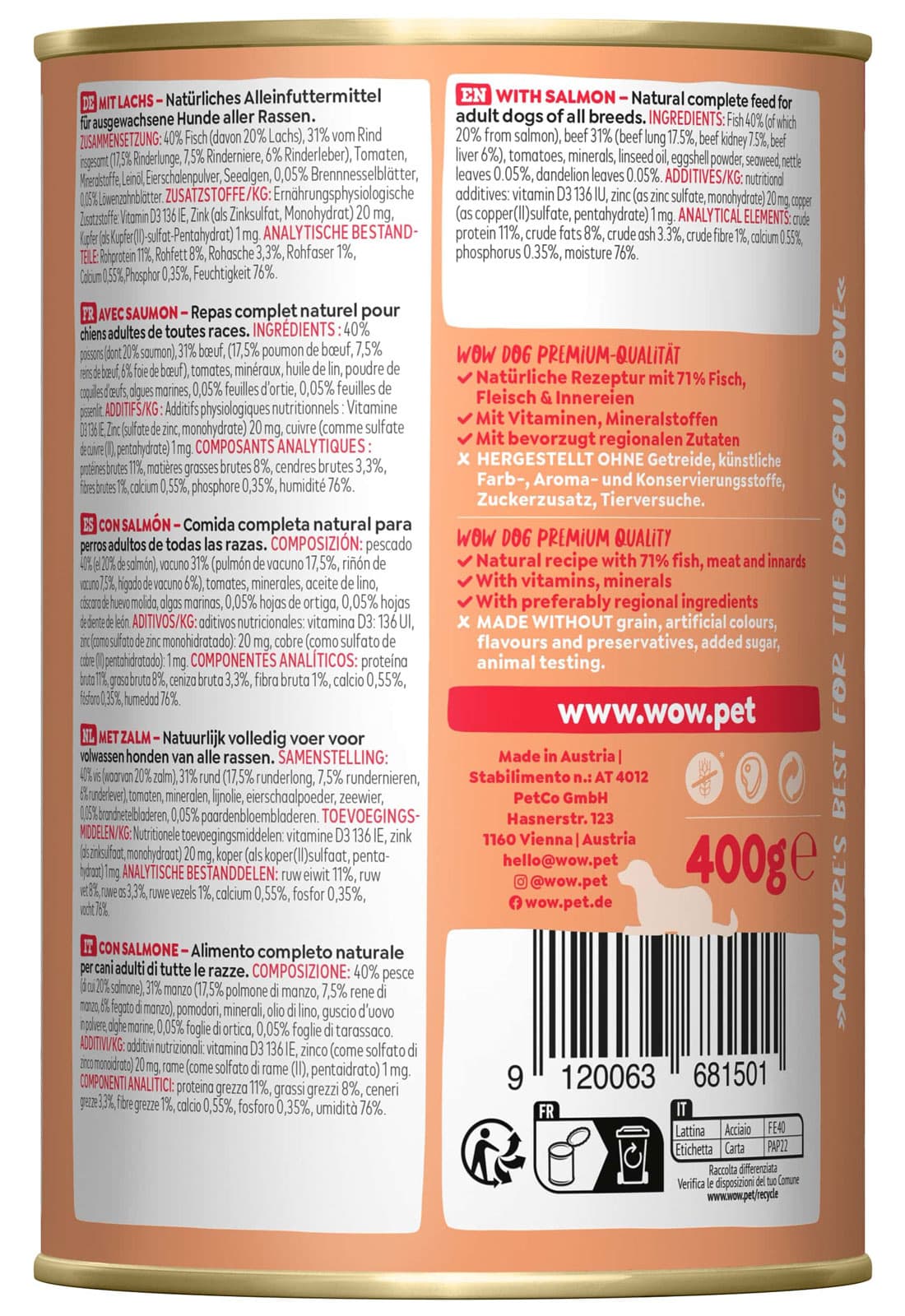 Zusammensetzung (Futter)40 % Fisch (davon 20 % Lachs), 31 % vom Rind insgesamt (17,5 % Rinderlunge, 7,5 % Rinderniere, 6 % Rinderleber), Tomaten, Mineralstoffe, Leinöl, Eierschalenpulver, Seealgen, 0,05 % Brennnesselblätter, 0,05 % Löwenzahnblätter.