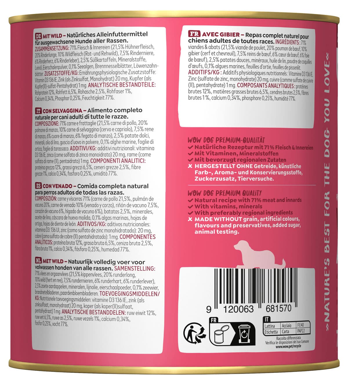 Zusammensetzung (Futter)71 % Fleisch & Innereien (21,5 % Hühnerfleisch, 20 % Rinderlunge, 10 % Wildfleisch (Rot- und Rehwild), 7,5 % Rinderniere, 6 % Rinderherz, 6 % Rinderleber), 2,5 % Süßkartoffeln, Mineralstoffe, Leinöl, Eierschalenpulver, 0,1 % Seealgen, Brennnesselblätter, Löwenzahnblätter.