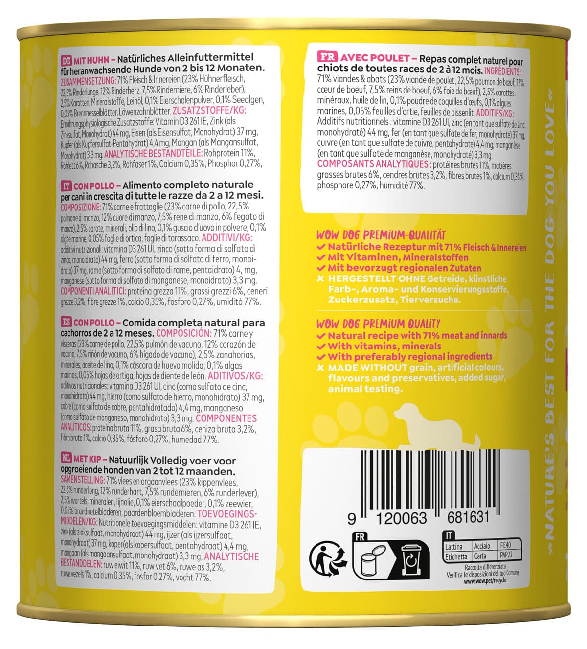 | Fütterungsempfehlung | Dose Junior 400/800g: 1-5kg: 150-500g, 5-10kg: 500-800g, 10-20kg: 800-1200g, 20-30kg: 1200-1600g, 30+kg: 1500kg+. |