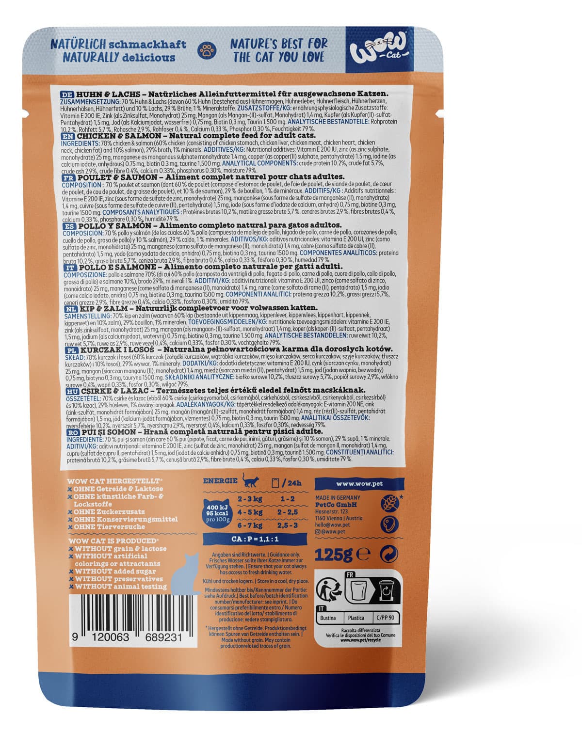 | Zusammensetzung (Futter) | 70 % Huhn & Lachs (davon 60 % Huhn (bestehend aus Hühnermagen, Hühnerleber, Hühnerfleisch, Hühnerherzen, Hühnerhälsen, Hühnerfett) und 10 % Lachs, 29 % Brühe, 1 % Mineralstoffe. |