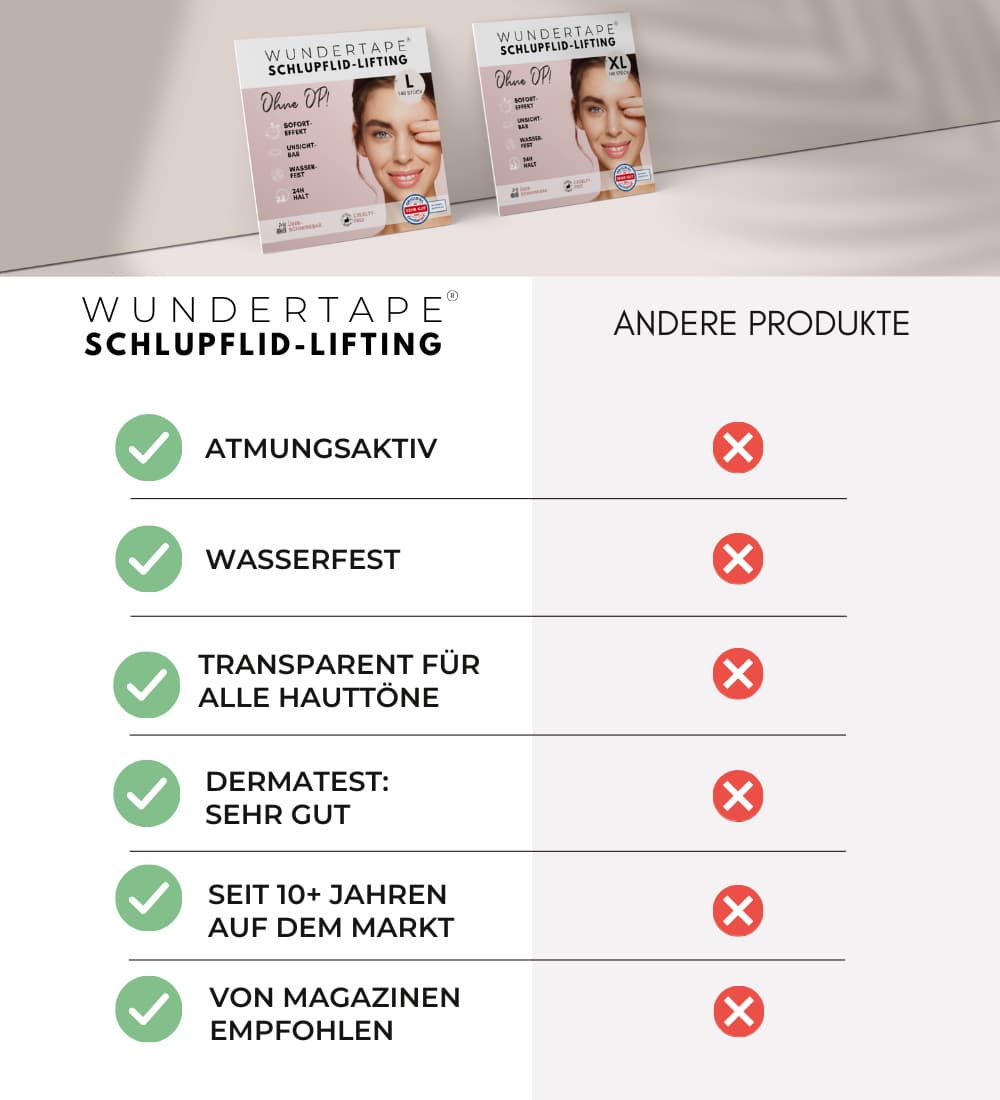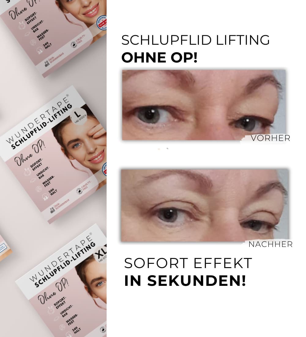 Entdecken Sie die Vielseitigkeit der WUNDERTAPE Schlupflider Stripes und erleben Sie selbst das sofortige Augenlid-Lifting ohne OP. Bestellen Sie jetzt und verleihen Sie Ihren Augen einen natürlichen, strahlenden Ausdruck!