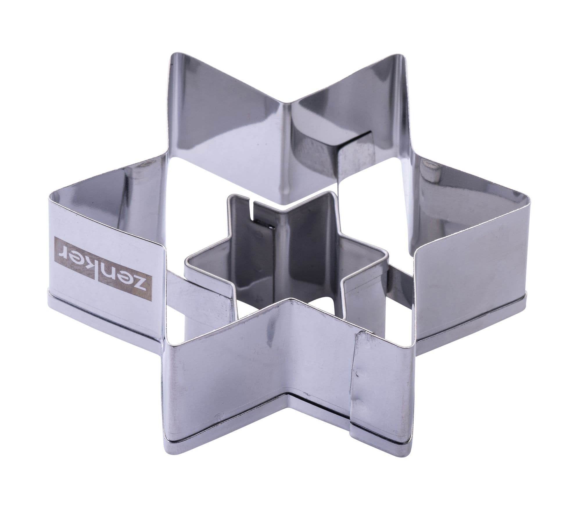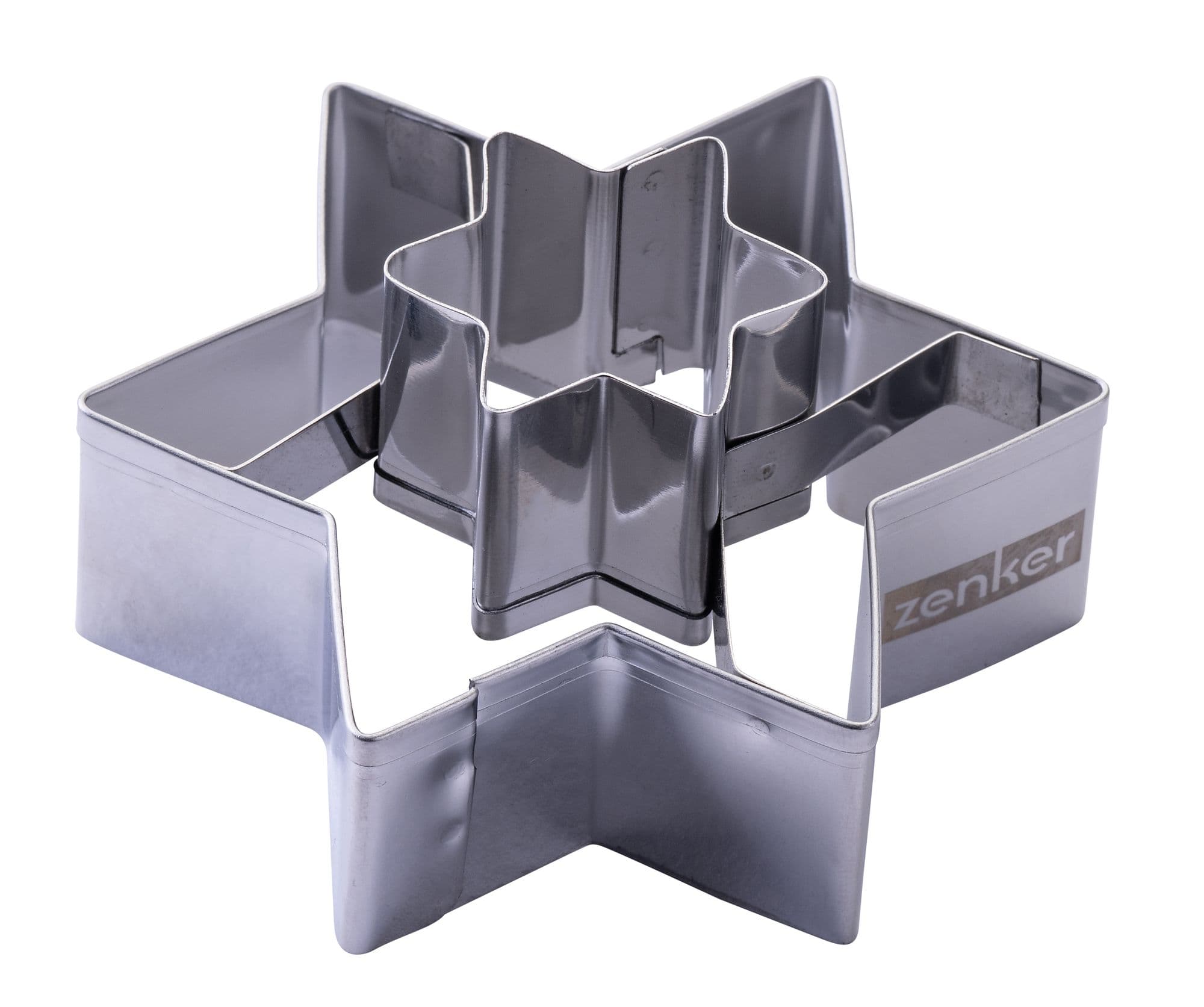 Der 2in1-Ausstecher „Linzer Stern“ aus der Serie „The Christmas Candy Shop“ von Zenker ist aus rostfreiem Edelstahl gefertigt und spülmaschinengeeignet. Mit 7,4 x 6,5 x 4 cm Größe sticht er wahlweise einen großen oder kleinen Stern aus – perfekt für Linzer Plätzchen. In schöner Geschenkverpackung mit Platz für den Namen des Empfängers, made und designed in Germany.