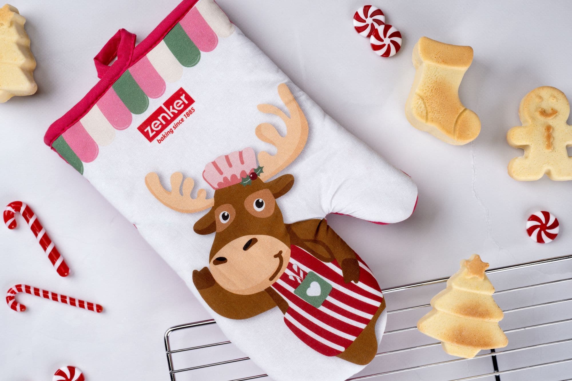 Der Back-/Topfhandschuh „The Christmas Candy Shop“ von Zenker schützt zuverlässig vor heißen Töpfen, Griffen und Formen. Aus weihnachtsroter Baumwolle mit Elch-Motiv gefertigt, misst er 28 x 18 x 3 cm und passt sowohl großen als auch kleinen Händen. Handreinigung empfohlen – designed in Germany für Weihnachtsstimmung in der Küche.
