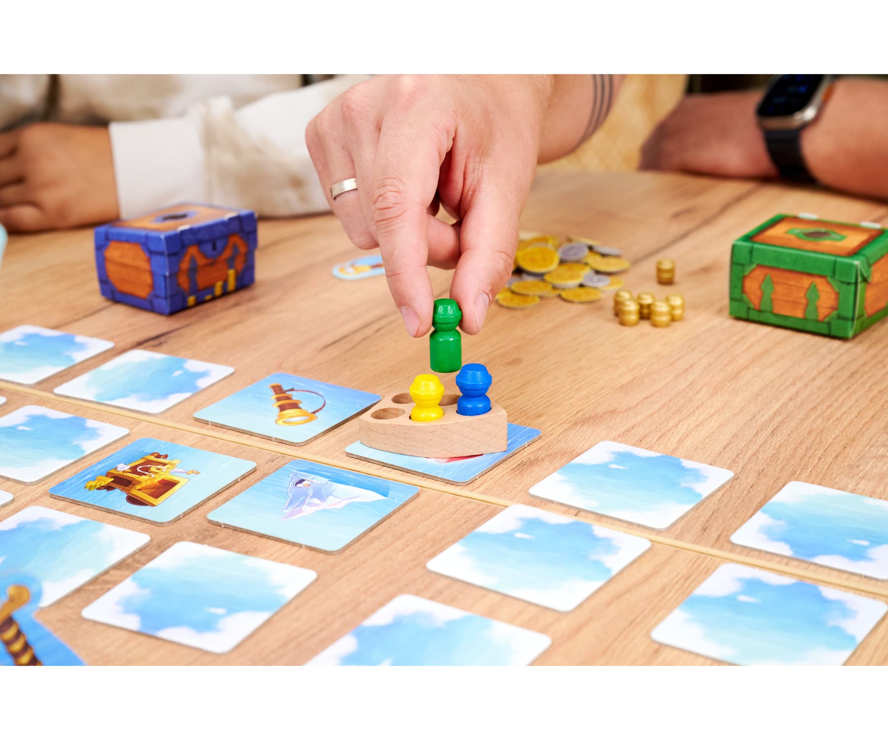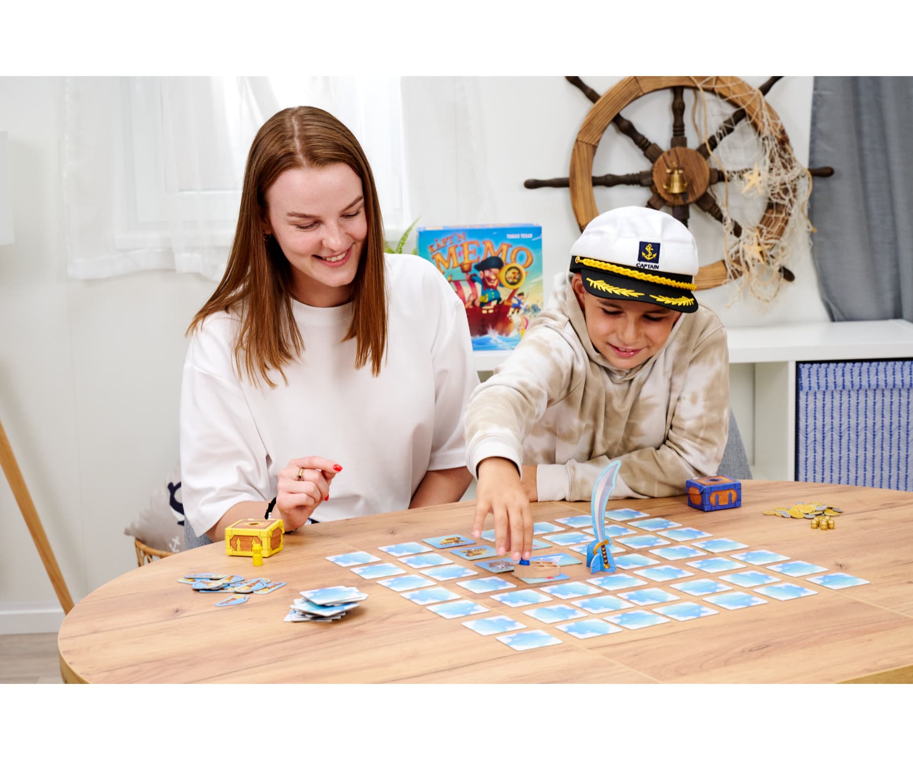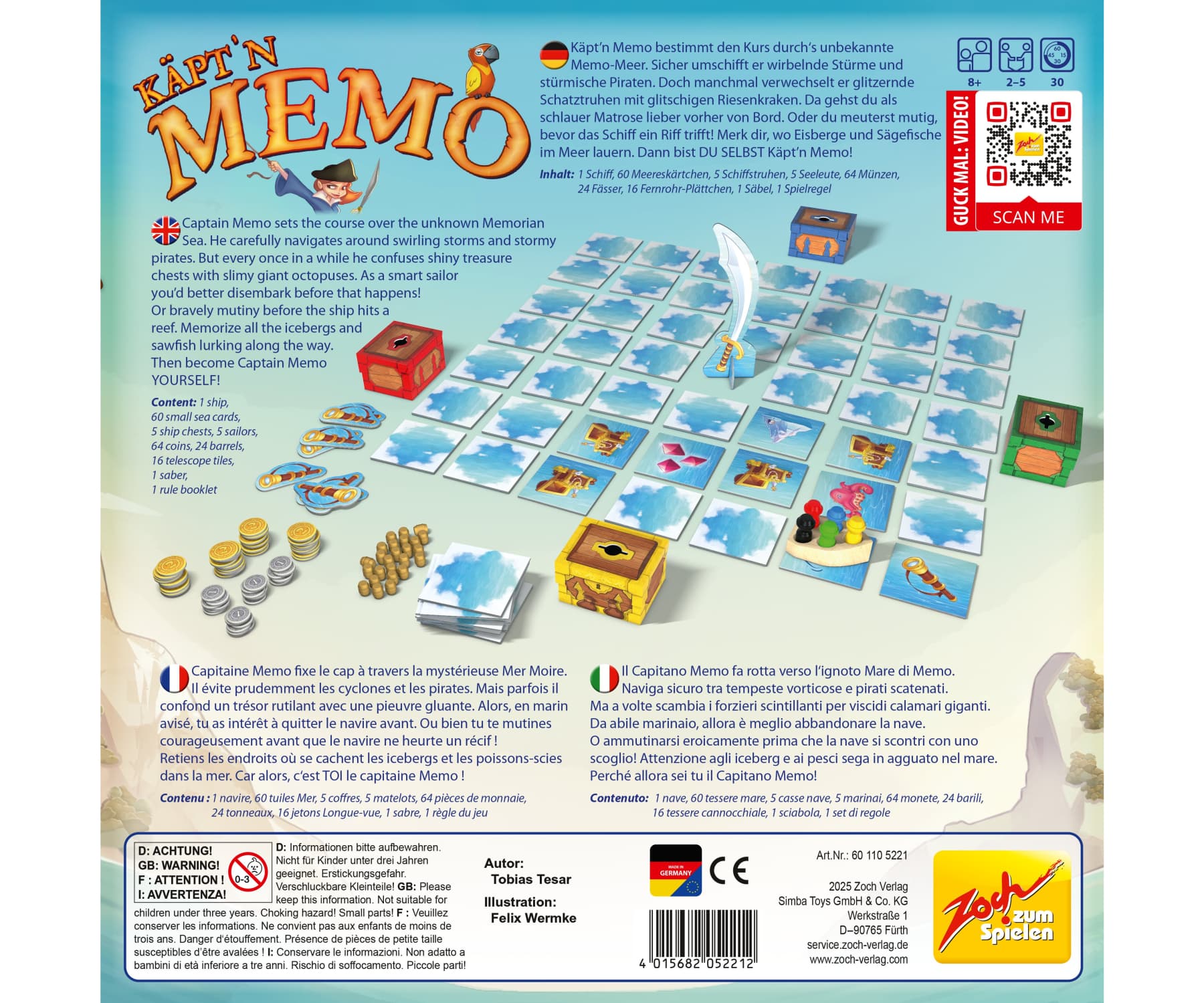 Alle Seeleute an Bord! Auf diesem Schiff hat Käpt’n Memo das Steuer fest in der Hand. Und weil alle Spieler mal in seine Rolle schlüpfen dürfen, bleiben seine Kursmanöver in bester – wenn auch nicht immer guter – Erinnerung. Zahlreiche Seefahrten nacheinander lassen 2-5 Spieler entdecken, was sich unter den Wellen des Memorischen Meers verbirgt, die als 7x7-Memory-Raster die Spielfläche bilden. Dort gibt es Schatzkisten zu heben, Rubine zu finden und mit nützlichen Fernrohren einen Blick über den Horizont hinaus zu erhaschen. Doch überall lauern auch Gefahren: Riffs und Riesenkraken können eine Seefahrt ebenso beenden wie Piraten oder Wirbelstürme. Nur Seebären mit einem sicheren inneren Kompass füllen die eigene Schiffstruhe mit wertvollsten Fundstücken. Gelingt es dem Käpt’n pro Seefahrt 5 Schatzkisten im Meer zu finden, profitieren davon jeweils auch die Mitspieler, die ihn als Matrosen begleiten. Doch werden ihnen die Routen zu heikel, gehen schlaue Matrosen rechtzeitig von Bord – oder rufen gar eine Meuterei aus. Kentert das Schiff danach, geht nur leer aus, wer allzu lange und leichtgläubig an Bord geblieben ist. Ausgedacht hat sich das merkenswerte Abenteuer auf Hoher See Tobias Tesar. Optisch schlagen die abenteuerlichen Illustrationen von Felix Wermke hohe Wellen. Kinder- und Familienspiel – Käpt’n Memo Für 2-5 Spieler ab 8 Jahren Mit der Kraft der eigenen Erinnerung trotzen 2-5 Seeleute allen Gefahren und heben wertvolle Schätze aus den Tiefen des Memorischen Meers. Für 2-5 Spieler ab 8 Jahren. Sprachen: D,GB,F,I