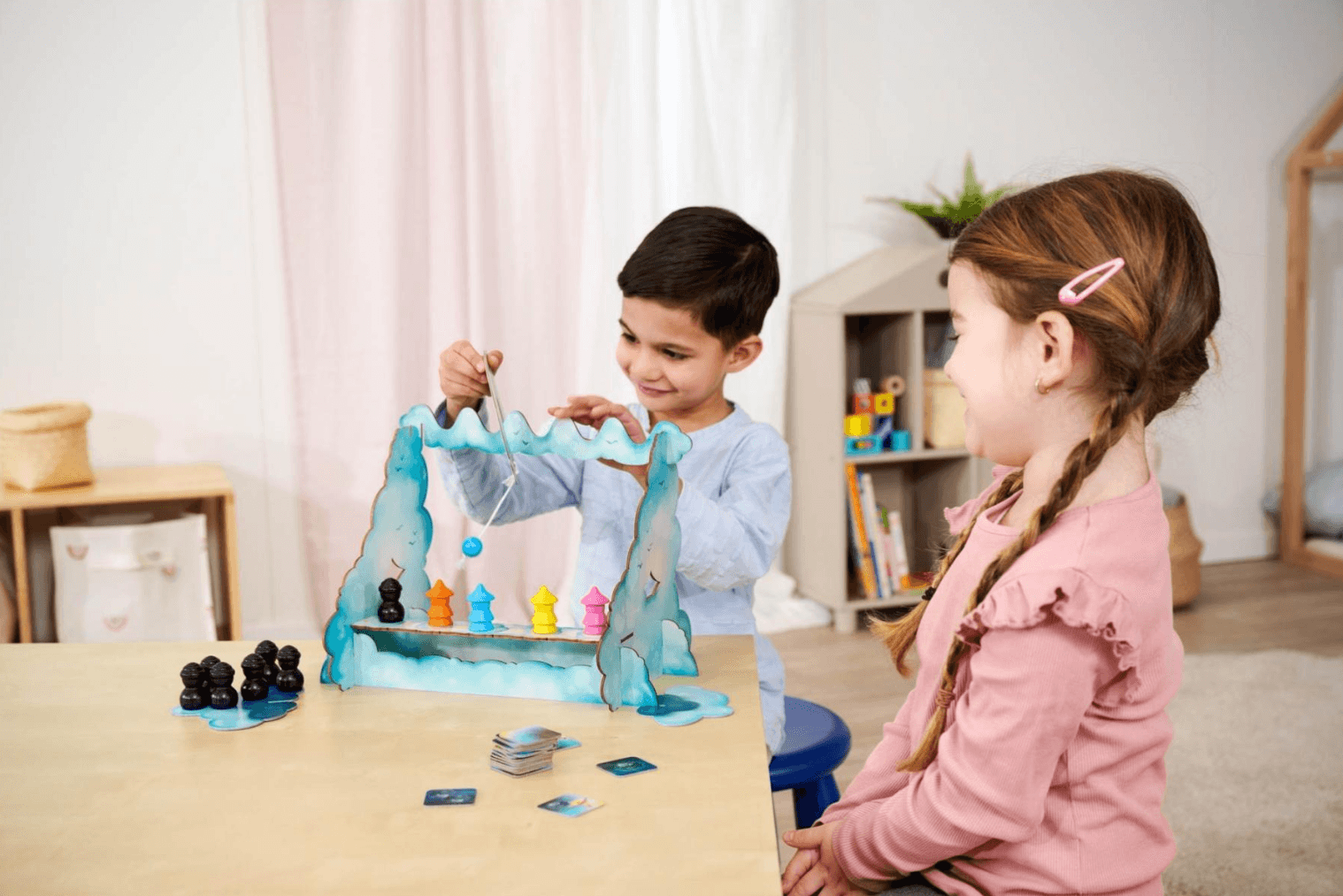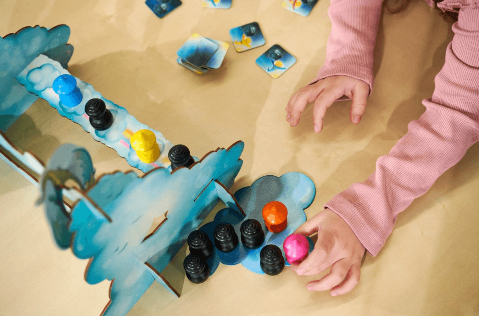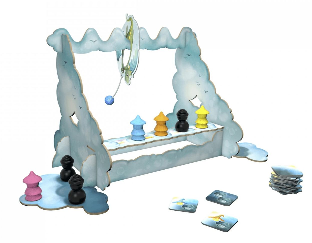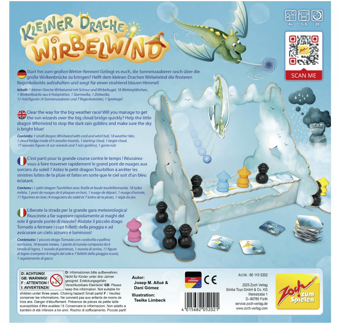 In luftiger Höhe braut sich ein Abenteuer zusammen! Im kooperativen Kinderspiel „Kleiner Drache Wirbelwind“ von Zoch helfen 1 bis 5 Spieler ab 4 Jahren den mutigen Sonnenzauberern, die griesgrämigen Regenkobolde zu vertreiben und die Sonne am Himmel zu halten. Mit Geschick, Teamwork und einer ruhigen Hand führt ihr die Sonnenzauberer über die wackelige Wolkenbrücke. Der kleine Drache Wirbelwind unterstützt euch dabei mit seiner Pendelkugel, mit der ihr die Kobolde von der Brücke wirbelt – aber Vorsicht: Die Sonnenzauberer dürfen nicht ins Wanken geraten! Das Spiel begeistert durch seine liebevoll gestalteten Holz-Elemente, farbenfrohe Illustrationen und eine fantasievolle Spielkulisse. Ideal für Familien, die gemeinsam spannende Abenteuer erleben möchten. Produktdetails: Spieleranzahl: 1–5 Altersempfehlung: ab 4 Jahren Spieldauer: ca. 20 Minuten Spieltyp: Kooperatives Lauf- und Geschicklichkeitsspiel Inhalt: Spielkulisse, Pendelkugel, Figuren, Spielmaterial aus Holz und Karton Autoren: Josep M. Allué & Dani Gomez Illustration: Teelke Limbeck Made in Germany