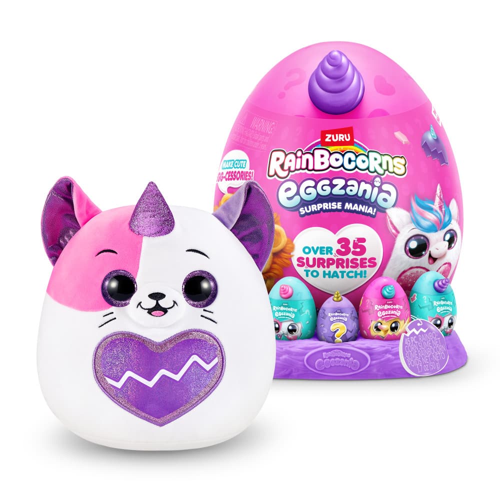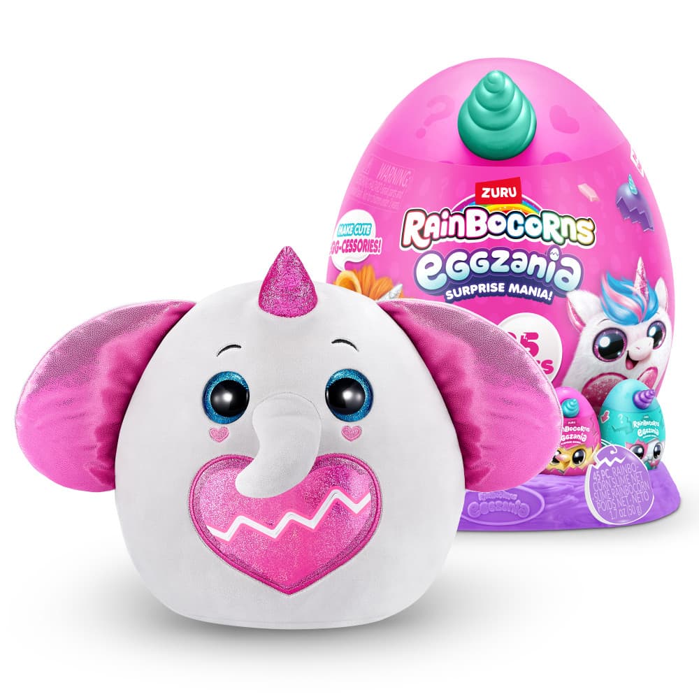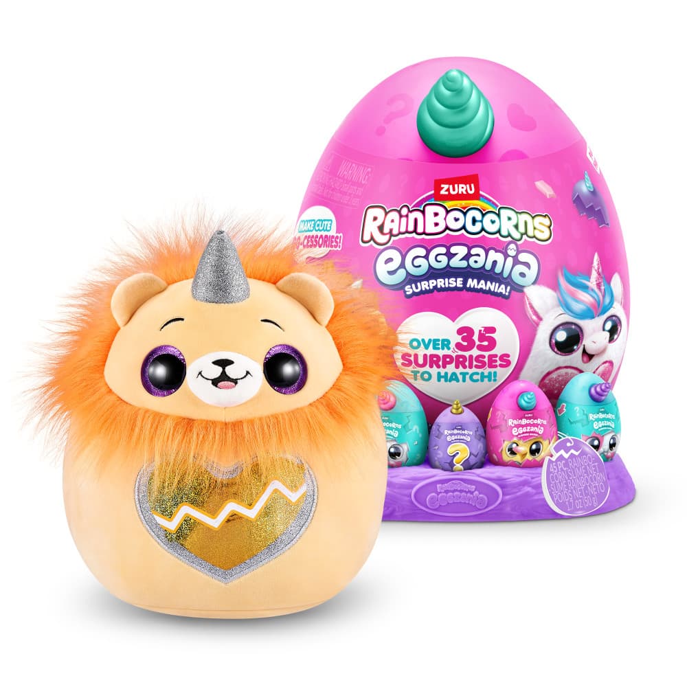 Schlüpfe in das brandneue Rainbocorns Eggzania! Dieses Ei ist voll mit über 20 Überraschungen und brandneuen, niedlichen Rainbocorns-Figuren. Entferne das Ei aus dem Nest, um dein supersüßes Rainbocorns Eggzania-Plüsch auszubrüten! Es gibt 6 Eggzania-Tiere zum Sammeln, darunter Roary der Löwe, Peanut der Elefant und Daffy der Flamingo! Jedes Eggzania-Plüschtier wird mit einem passenden Yolkie, 5 Mini-Eiern, Aufklebern, tragbaren Accessoires und einem Eggzania-Wortspiel geliefert, das dich zum Lachen bringen wird! Betritt Rainboville mit einem Ring, einem Stempel und einem DIY-Armband, die zu deinem Eggzania passen! Diese seidig weichen Rainbocorns lieben es zu kuscheln und werden dich das Leben von der sonnigen Seite aus betrachten lassen! Welches Eggzania wirst du ausbrüten?